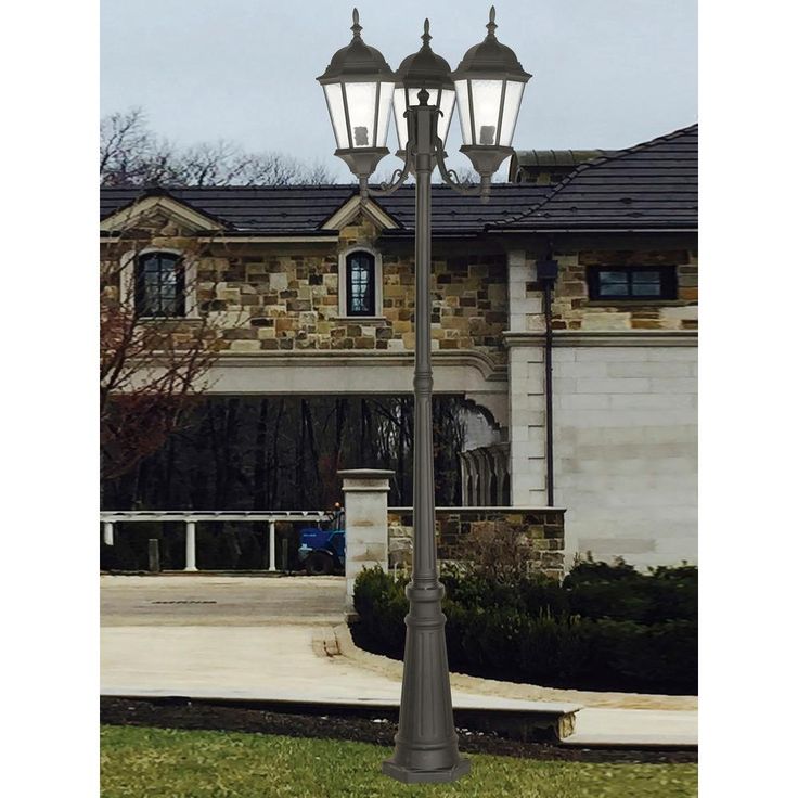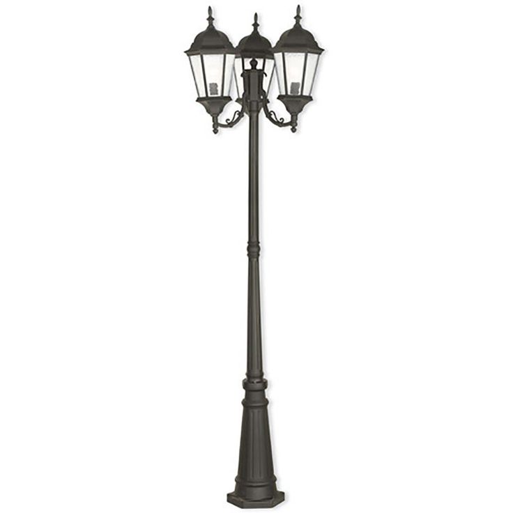 A decorative top and arm are paired with a simple six-sided frame in this textured black and clear water glass outdoor multi head post lanterns are constructed of cast aluminum.