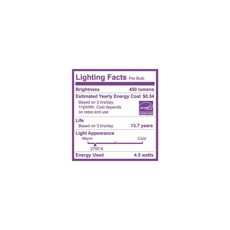 • Energy used: 4.5-Watt (equivalent to a 40-Watt standard incandescent light bulb)