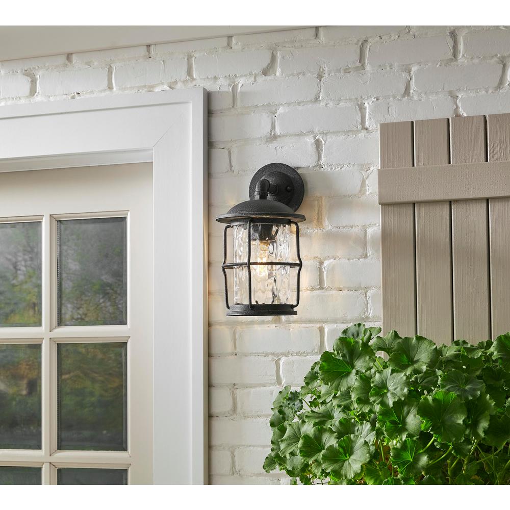 Transform your outdoor spaces with this exquisite wall lantern. The gilded iron finish and water glass shade create a captivating interplay of light and texture, adding a touch of rustic charm to any exterior. Pair it with a wooden door or brick wall for a harmonious aesthetic. This lantern is not just a light fixture; it's a statement piece that elevates your home's curb appeal.