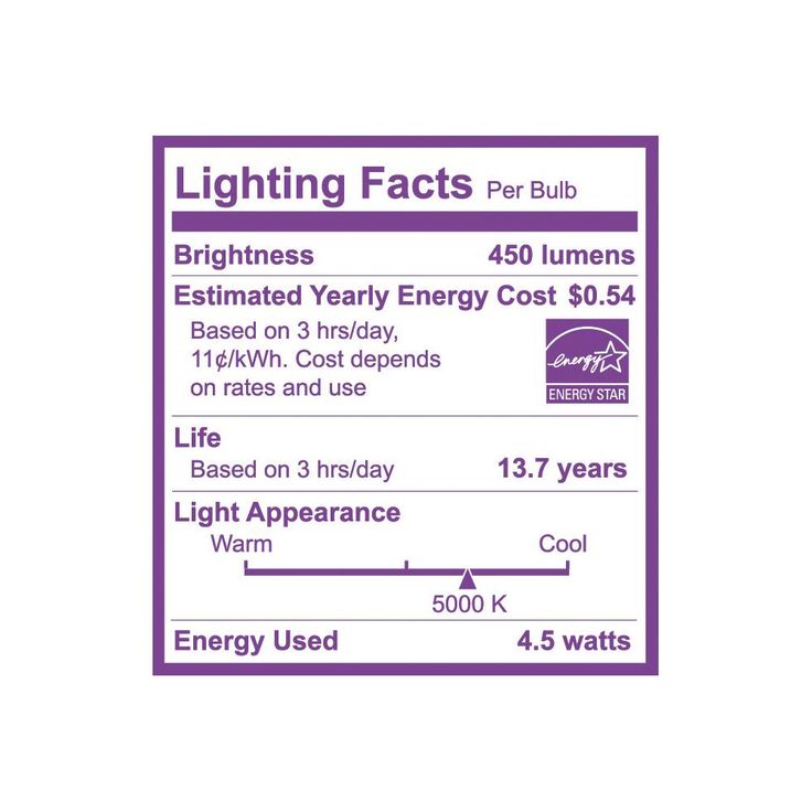 • Estimated yearly energy cost: $0.54 (based on 3-hours/day, 11¢/kWh, cost depend on rates and use)