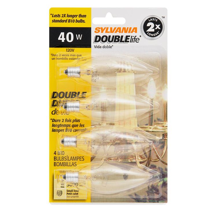 Regular price $3.97The SYLVANIA Double Life 40-Watt Decorative Blunt Tip Light Bulbs will give your home the decorative touch it needs. With a long life of 3,000-hour, Sylvania Double Life gives you the freedom of fewer bulb changes. The clear finish allows the bulb's 320-Lumen to light up any fixture.