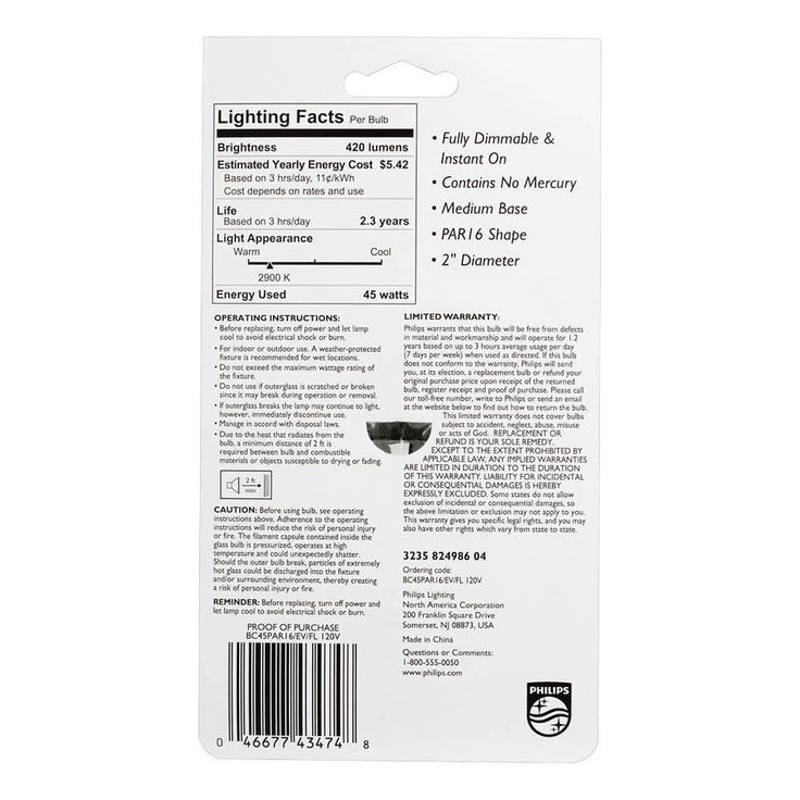 The Philips 45-Watt Flood Light Bulb can shine for up to 2,500-hours. This flood bulb provides a round beam of bright, white light making this bulb ideal for your home or business's recessed can or track lighting fixtures. You can also use this bulb for your outdoor security lighting applications as well.