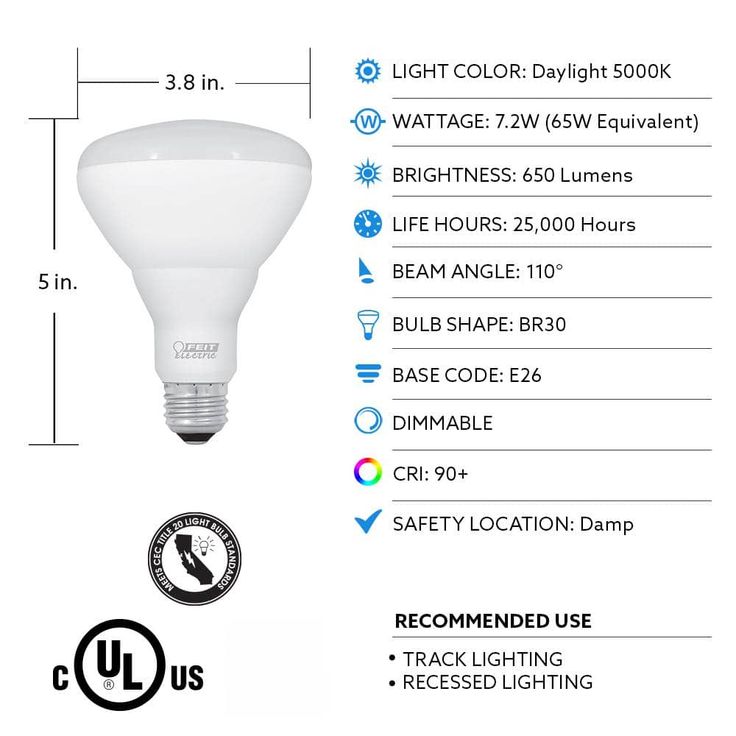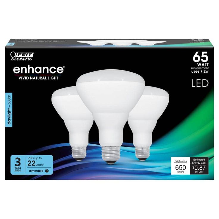 The Feit Electric LED Enhance product line features our highest quality energy efficient light. This bright daylight BR30 reflector LED light bulb produces a similar light output of 650 Lumens but only uses 7.2-Watt of electricity, up to 89% less energy than a standard 65-Watt incandescent light bulb. This high performance bulb also has a high (CRI) of 90+ so colors appear more realistic and vibrant. Get instant on to full brightness with relatively cool running performance. These Feit Electric BR30 bulbs have an average life of 25,000-hour/22.8 years are RoHS compliant and 100% mercury free. Choose a dependable ENERGY STAR approved bulb for general purpose residential or commercial applications. Suitable for enclosed fixtures or outdoor use.