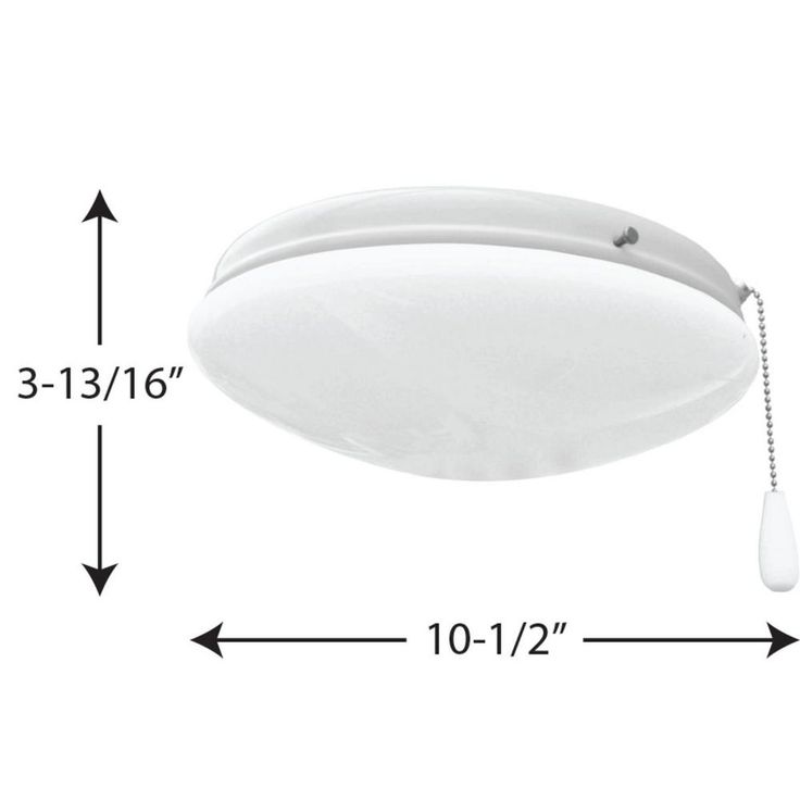 Two-light universal-style ceiling fan light kit features a low-profile, opal glass diffuser that's ideal for lighting in a bedroom. This fan light kit includes a threaded adapter for quick connection to most indoor ceiling fans that accept an accessory light. Includes two 3000K, 800 lumen each (source), Title 24 certified LED bulbs. White finish.