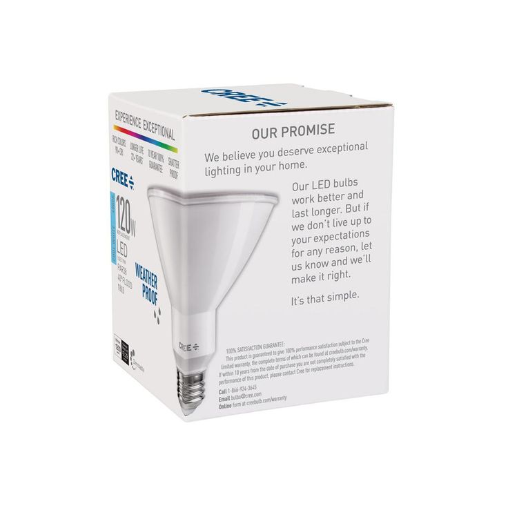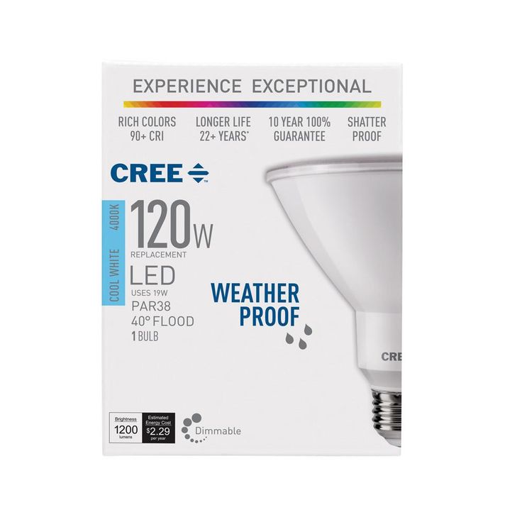 We believe you deserve to experience exceptional lighting in your home. That's why Cree LED bulbs are engineered to work better and last longer. The Cree PAR38 LED bulb delivers a bright white (3000K) light with a focused beam that creates wide pools of light. Rated for wet locations, the Cree PAR38 LED flood light is an ideal choice for use in outdoor security and landscape lighting. This LED flood light also has high color rendering and is designed to enhance your home and make the colors around your home appear vibrant, richer and more natural. Designed to last more than 22-year (25,000-hour), the Cree PAR38 LED flood light is dimmable and backed by a worry-free 100% performance satisfaction guarantee. Because when a light bulb is designed to be in your home for decades, an exceptional experience is worth it.