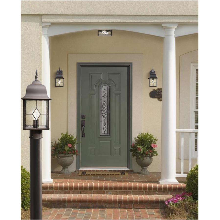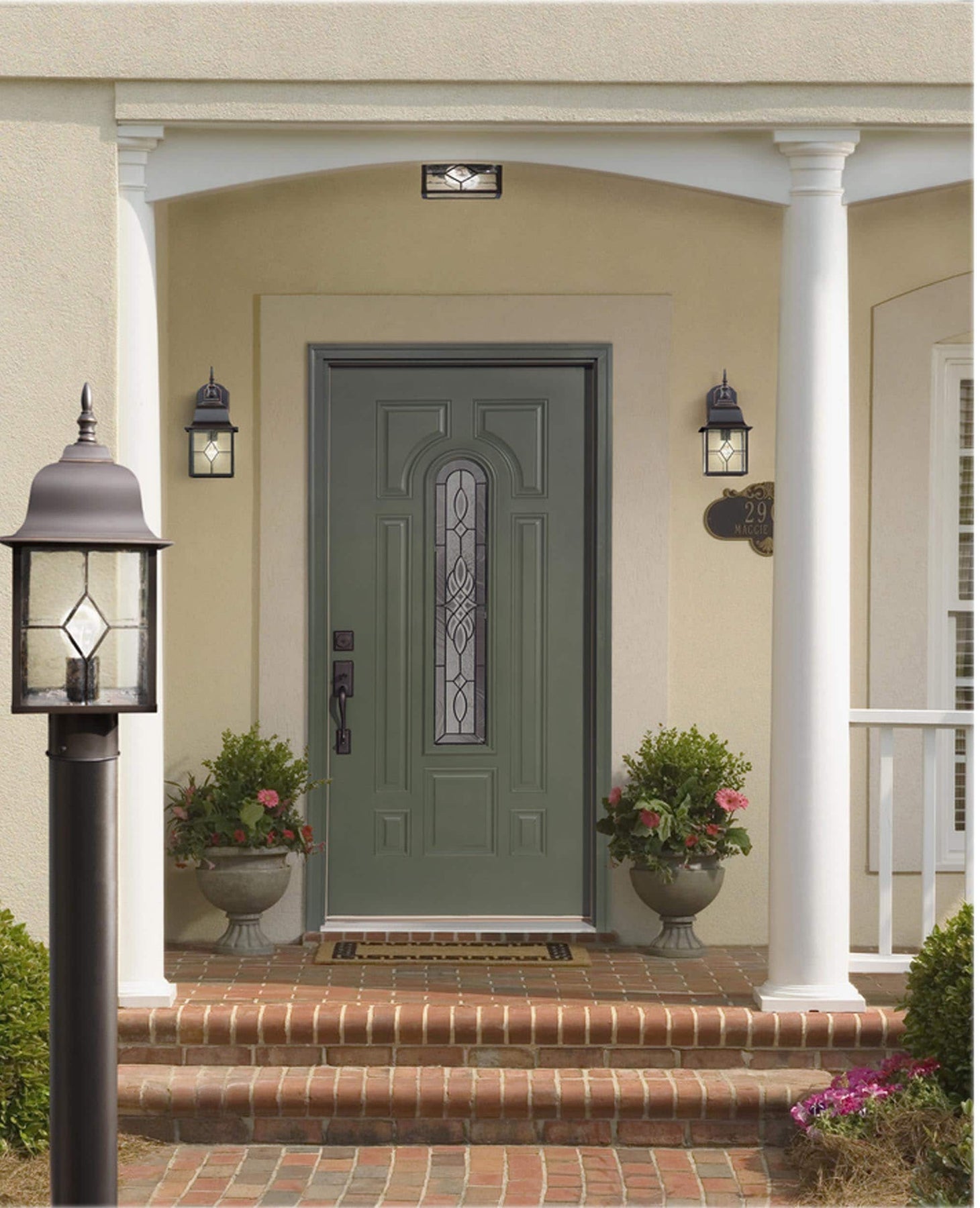 Litshire’s oil-rubbed bronze silhouette and beveled, seeded glass create a warm, faceted glow that feels both classic and fresh. The crisp square frame and diamond glass motif lend architectural polish to any entry. Pair it with a painted front door and planters in aged terracotta to echo its artisanal texture. It’s a quietly luxurious finishing touch that welcomes you home in style.
