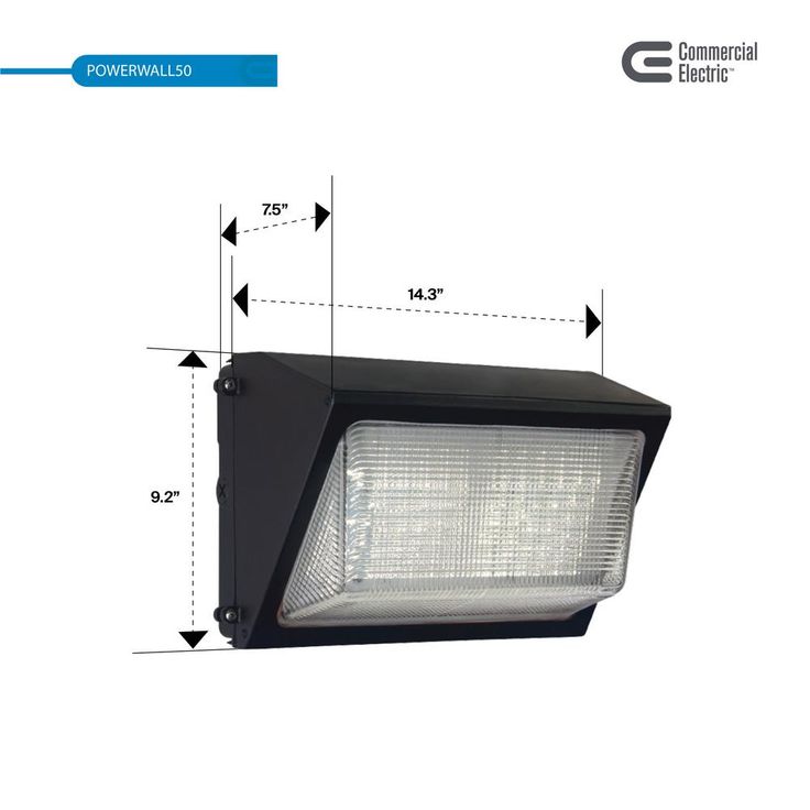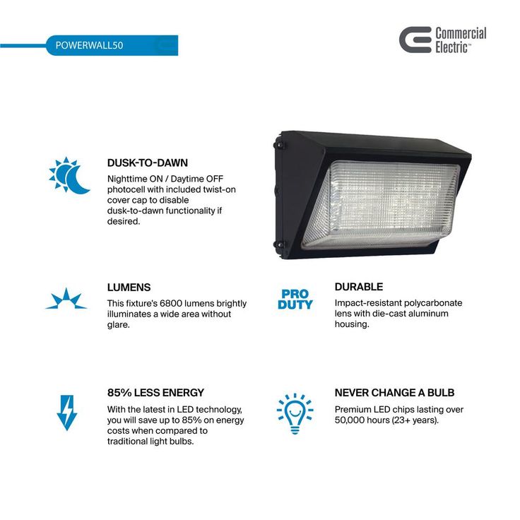 When it comes to brightness, the Commercial Electric Integrated LED Wall Pack and Dusk to Dawn Outdoor Light brings the light and the power. This LED wall pack is a one-of-a-kind product that can be used an outdoor security light to illuminate any space. The 6800-lumen intensity delivers a strong beam of 4000K CCT natural white light sure to supply the right amount for residential and commercial applications that require high brightness. From garages, large backyards, commercial loading bays, warehouses, apartment complexes, or even office and retail complexes- the PowerWall is a versatile fixture. One of the biggest highlights of this LED wall pack is that it’s configured to be either an automatic dusk to dawn outdoor light or for manual ON/OFF operation. Additionally, this LED wall pack was designed with ease of installation and ease of use in mind. Should you have any questions regarding installation, replacement parts, or general questions, a Commercial Electric lighting specialist can be reached quickly by calling our lighting specialists at 1-844-548-3776 or email us at support@commercialelectric.zendesk.com