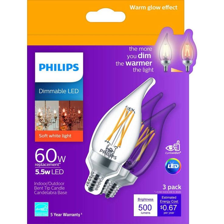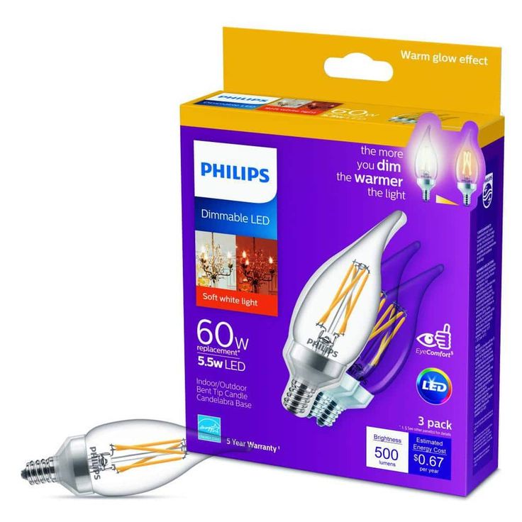 Philips LED light bulbs are a smart alternative to standard incandescent and designed to deliver everyday value and effective, consistent light. With this dimmable warm glow bulb in soft white, the more you dim, the warmer the light. Warm glow dimming effect offers a new experience for LED dimming by creating a soft, diffused light and smooth dimming range with color temperatures ranging from 2200K-2700K as you dim. This Energy Saving 5.5-Watt LED candle light bulb provides a warm and comfortable light, perfect for use in kitchens, dining rooms, family rooms, bedrooms and foyers. Philips LED candles radiate a clear, white light that enhances the decorative appeal of your fixtures, all while saving you money.
