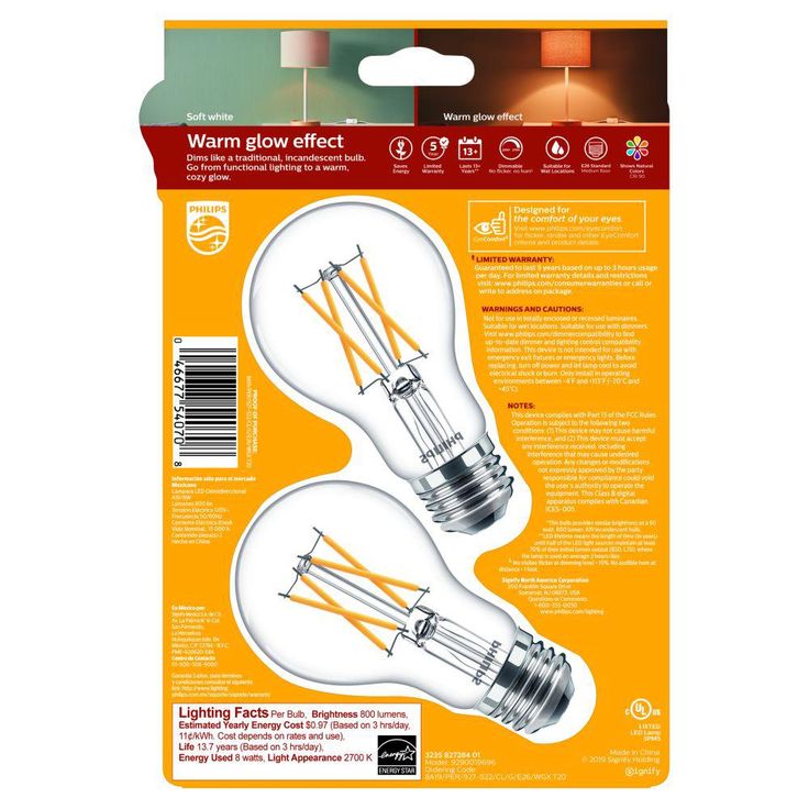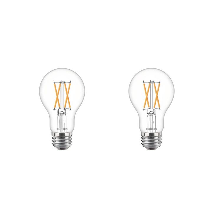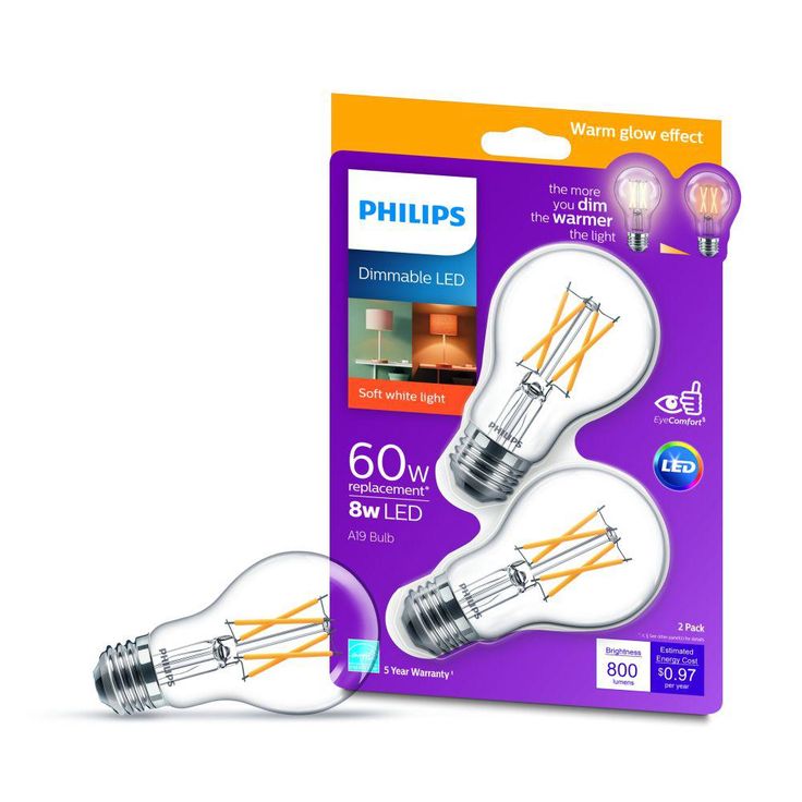 Philips 60-Watt Equivalent A19 Dimmable with Warm Glow Dimming Effect Clear Glass LED Light Bulb Soft White (2700K) (2-Pack)