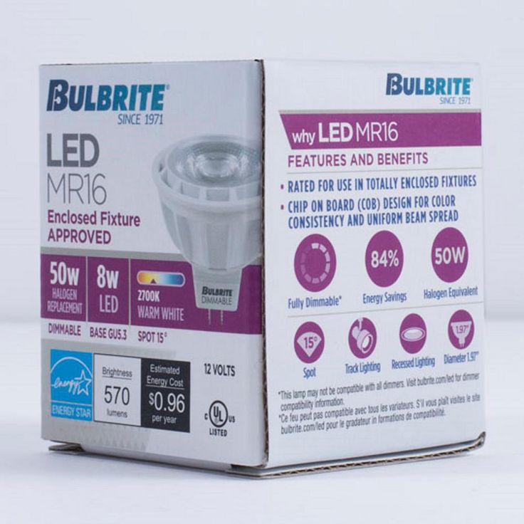 - LED MR16: 84% energy savings when compared to halogen equivalent, lasts 12.5 times longer than halogen equivalent, dimmable, rated for use in totally enclosed fixtures, ENERGY STAR qualified, UL rated for damp locations