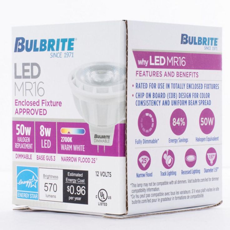 • Specifications: 8-Watt, 570 Lumens, 80 CRI, 25000-hour average rated life, bi-pin (GU5.3) base, maximum overall length is 1.87 in. and bulb diameter is 1.97 in.