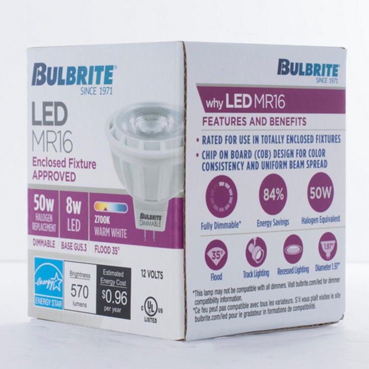 • LED MR16: 84% energy savings when compared to halogen equivalent, lasts 12.5 times longer than halogen equivalent, dimmable, rated for use in totally enclosed fixtures, ENERGY STAR qualified, UL rated for damp locations