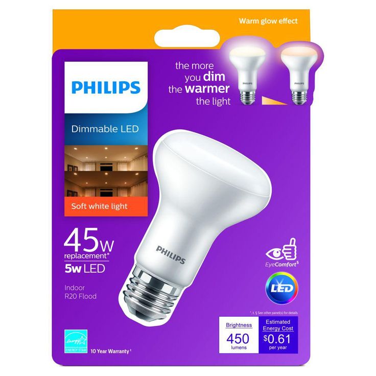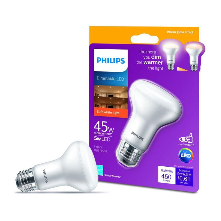 The more you dim, the warmer the light with the Philips R20, featuring a fully dimmable, warm glow light effect. This LED R20 offers a new experience for dimmable LEDs by creating a soft, diffused light and smooth dimming from 2700K to 2200K. As the light is dimmed, the color temperature is reduced and creates a warm, relaxing ambiance. Until now, this warm, dimming effect was only available in dimmable halogen and incandescent light bulbs. Now you can enjoy the perfect alternative for those household applications where ambience is as important as lowering energy bills and reducing the hassle of frequently replacing light bulbs. This bulb is ENERGY STAR certified and ideal for residential use in kitchens, living rooms, dining rooms, bedrooms and dens, as well as commercial use in restaurants and hospitality applications. It is perfect for recessed cans or track light fixtures, offering soft white light for a pleasant and inviting feel.