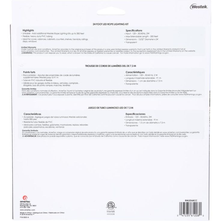 • Day white (4500K) light, 280 Lumens, 120VAC 60 Hz, 6-Watt, 0.08 Amp, 13 mm diameter, IP44, 36 LED's/M (1 LED per 1 in.), 50000 hour LED life, ETL Listed