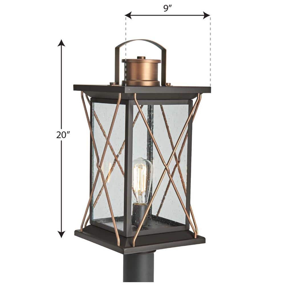 Bring farmhouse charm to your outdoor space with the Barlowe 1-light post lantern. Its antique bronze finish with antique copper accents frames clear seeded glass for warm, inviting illumination on 4x4 posts. Hardwired and dimmable, it supports one E26 bulb up to 100W.