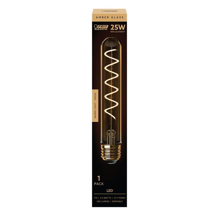 Add a vintage touch to your home or business with the 25-Watt Equivalent Warm White (2000K) T10L Dimmable Spiral Filament LED Vintage Style Large Amber Glass Light Bulb from Feit Electric. The bulb features a classic filament design for an old-fashioned appearance that evokes the feel of an original old fashioned-style bulb. Its extra warm white (2000K) color with a warm light glow is perfect for clear shade lamps or exposed-bulb lighting applications. This light bulb is dimmable, helping you enhance the mood of a room by adjusting the brightness. Return to retro with this oversized vintage light bulb that can be the highlight of any room or accent existing decor without the need for an additional pendant or shade.