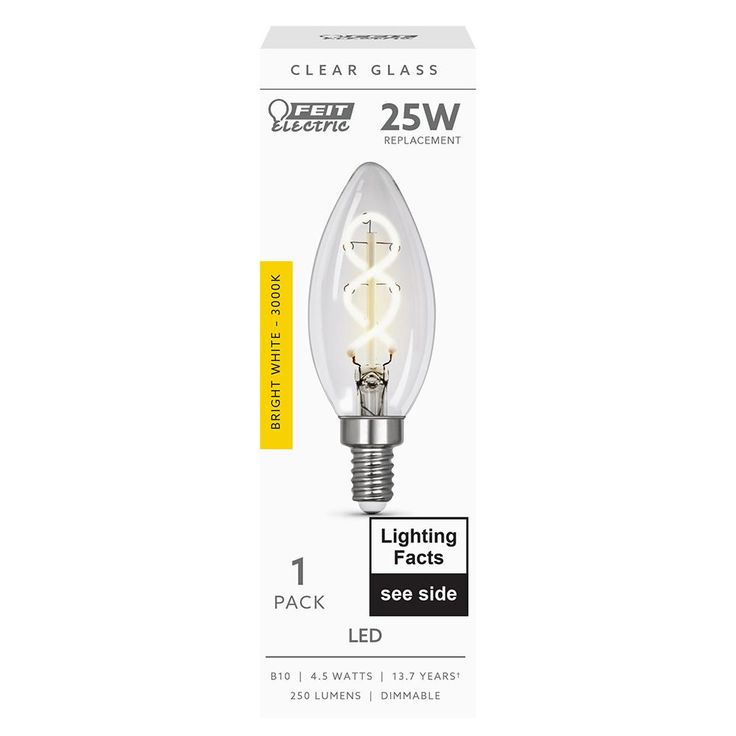Combine classic style, modern reliability and energy savings with Feit Electric B10 LED 25-Watt Equivalent Bright White (3000K) Spiral Filament Light Bulb. Our vintage filament bulbs are made with LED exposed filament and wrapped in a clear housing to deliver an elegant antique look and feel. We integrate innovative LED technology with a unique spiral filament, providing a natural lighting experience for those that want the benefits of LED's and the look of a vintage lighting. Filament LED's will last for years and use just a fraction of the energy of an incandescent.