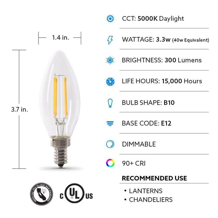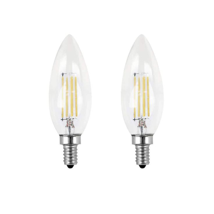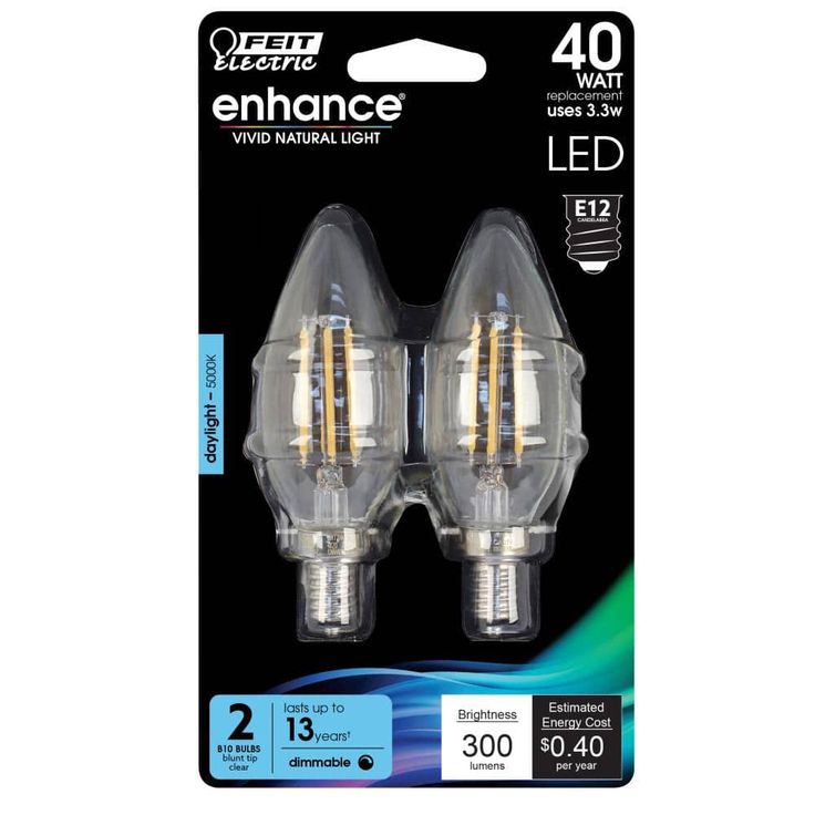 Combine classic style, modern reliability and energy savings with Feit Electric CA10 LED 40-Watt Equivalent Daylight (5000K) 2-Straight Filament Light Bulb. Our vintage filament bulbs are made with LED exposed filament and wrapped in a clear housing to deliver an elegant antique look and feel. We integrate innovative LED technology with a traditional filament, providing a natural lighting experience for those that want the benefits of LED's and the look of a vintage lighting. Filament LED's will last for years and use just a fraction of the energy of an incandescent.