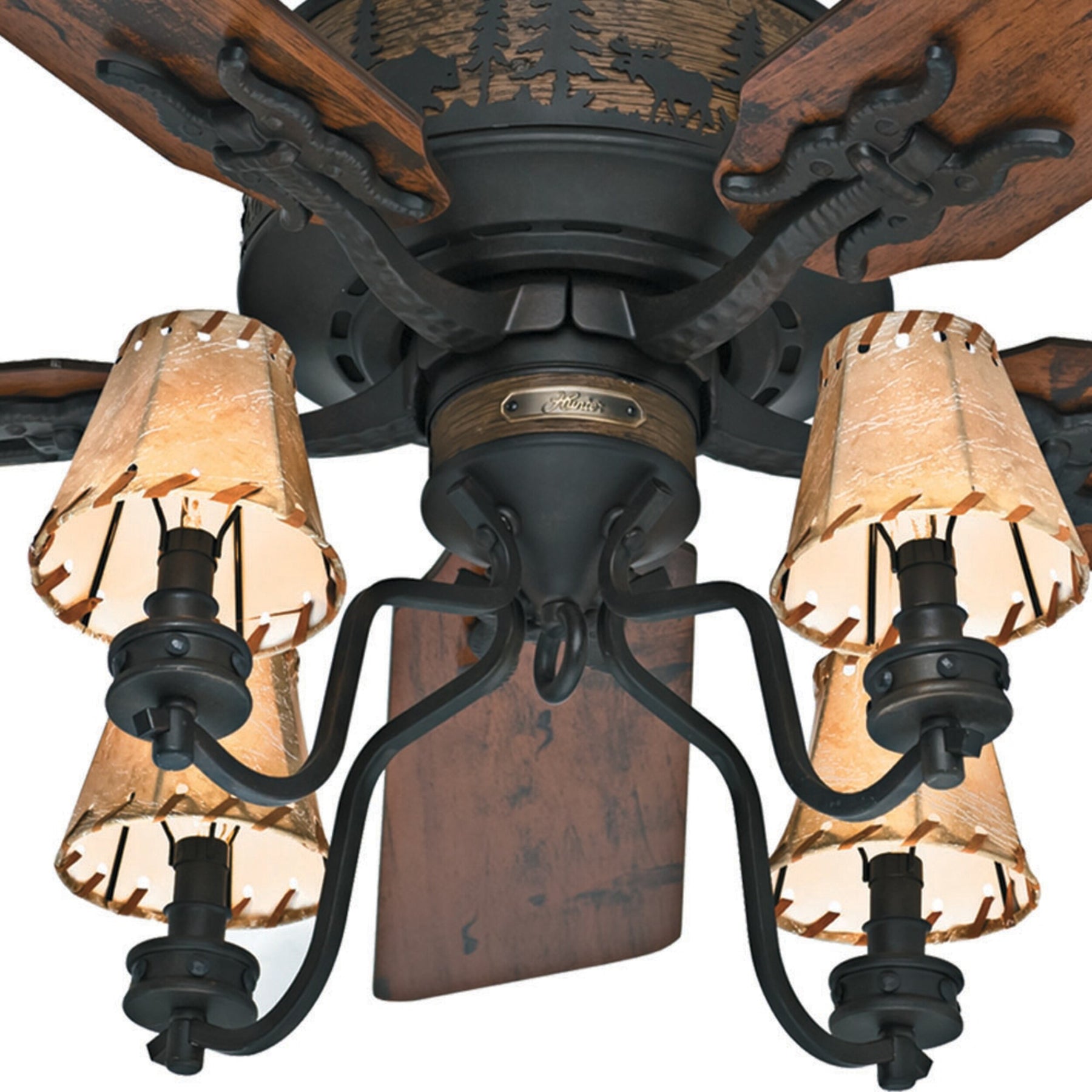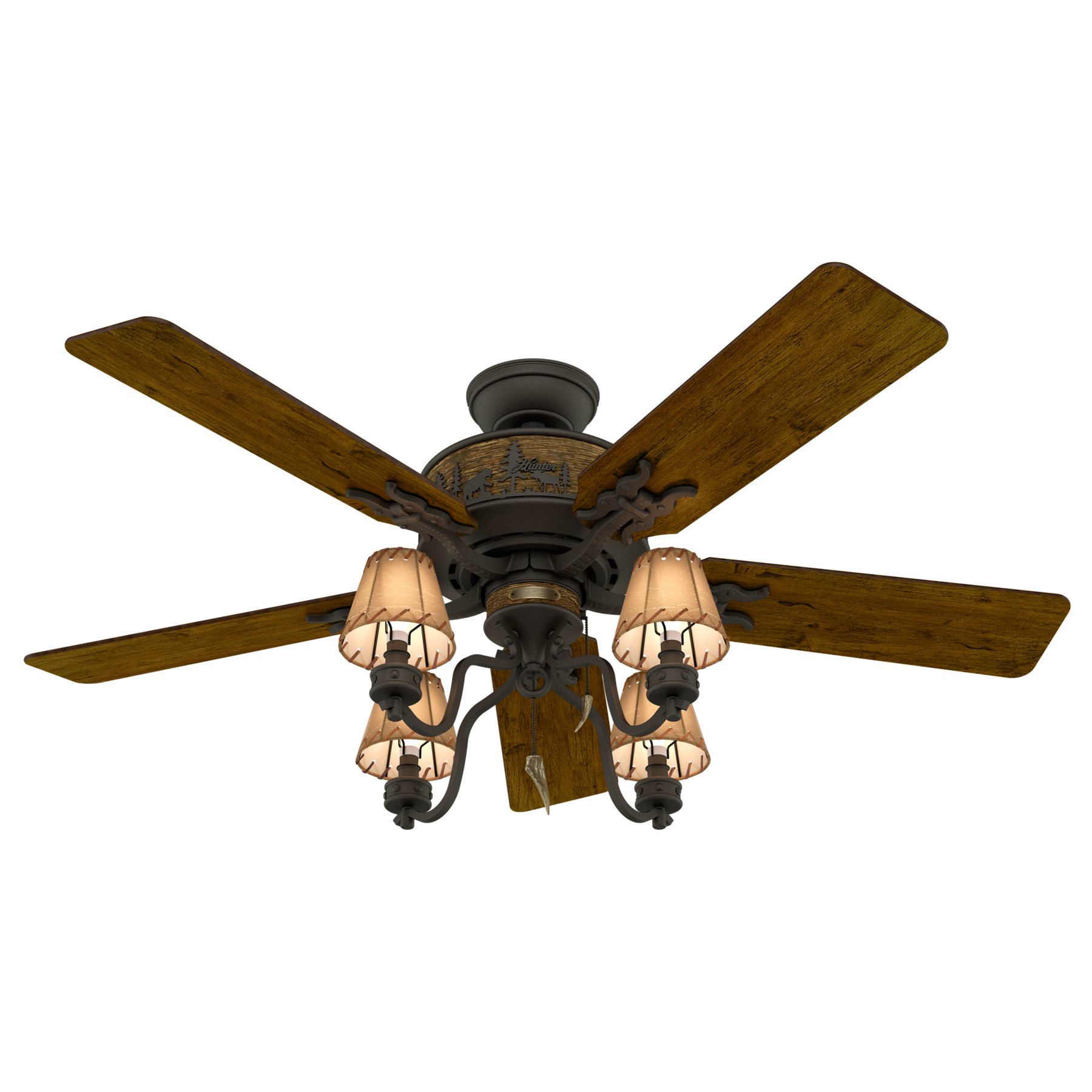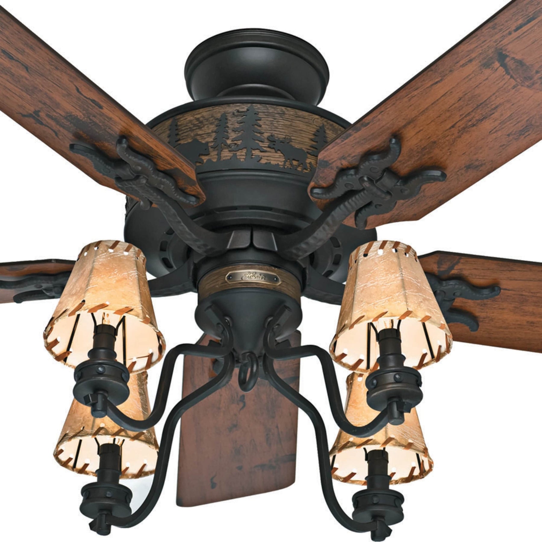 The Hunter Adirondack brings rustic lodge style and quiet performance to large indoor rooms. Its WhisperWind AC motor powers five 52-inch blades, while the included four-light kit with faux-leather shades creates a warm, inviting glow.