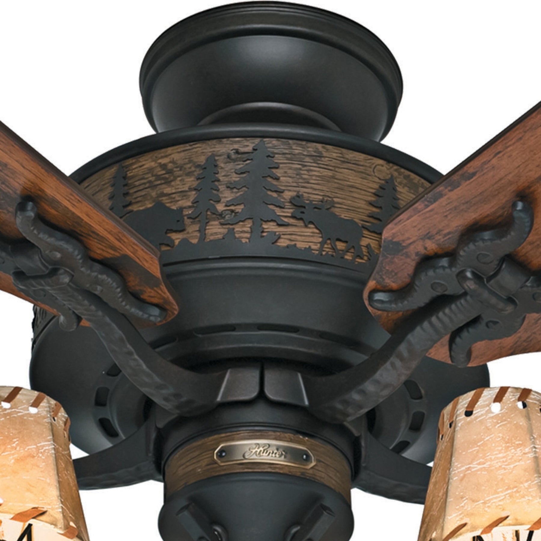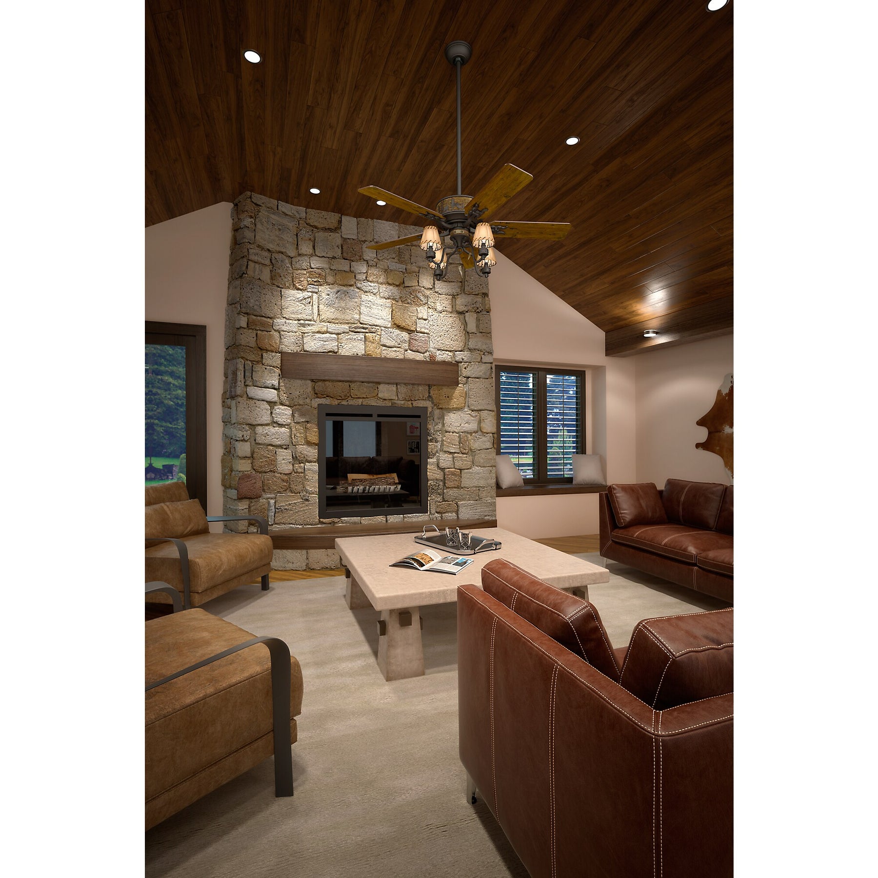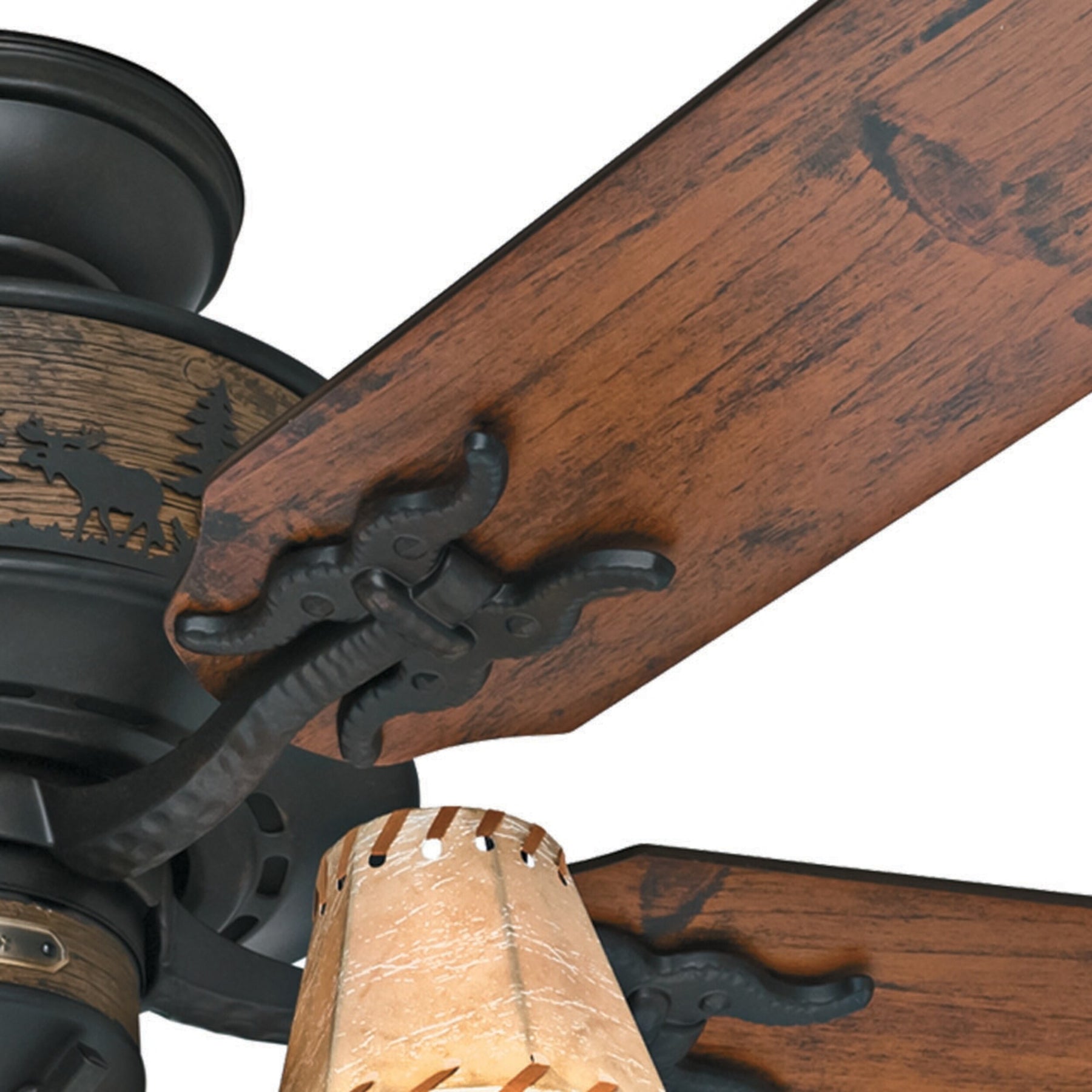 The Hunter Adirondack brings rustic lodge style and quiet performance to large indoor rooms. Its WhisperWind AC motor powers five 52-inch blades, while the included four-light kit with faux-leather shades creates a warm, inviting glow.
