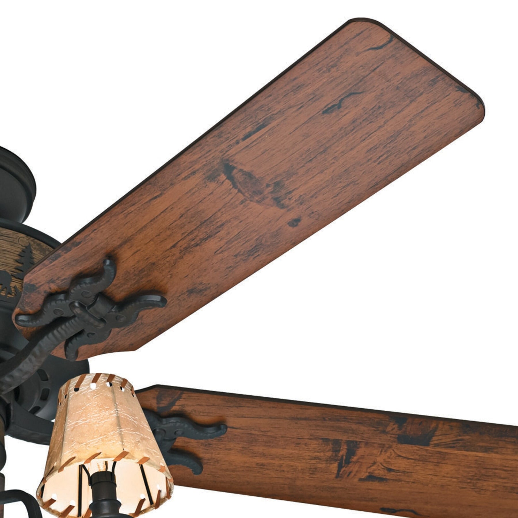 - Rustic Design: Brittany Bronze finish with distressed cherry reversible blades and faux-leather shades