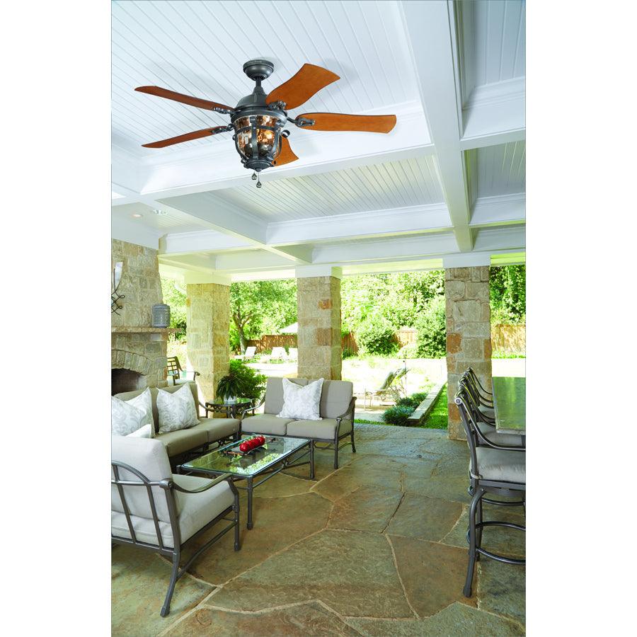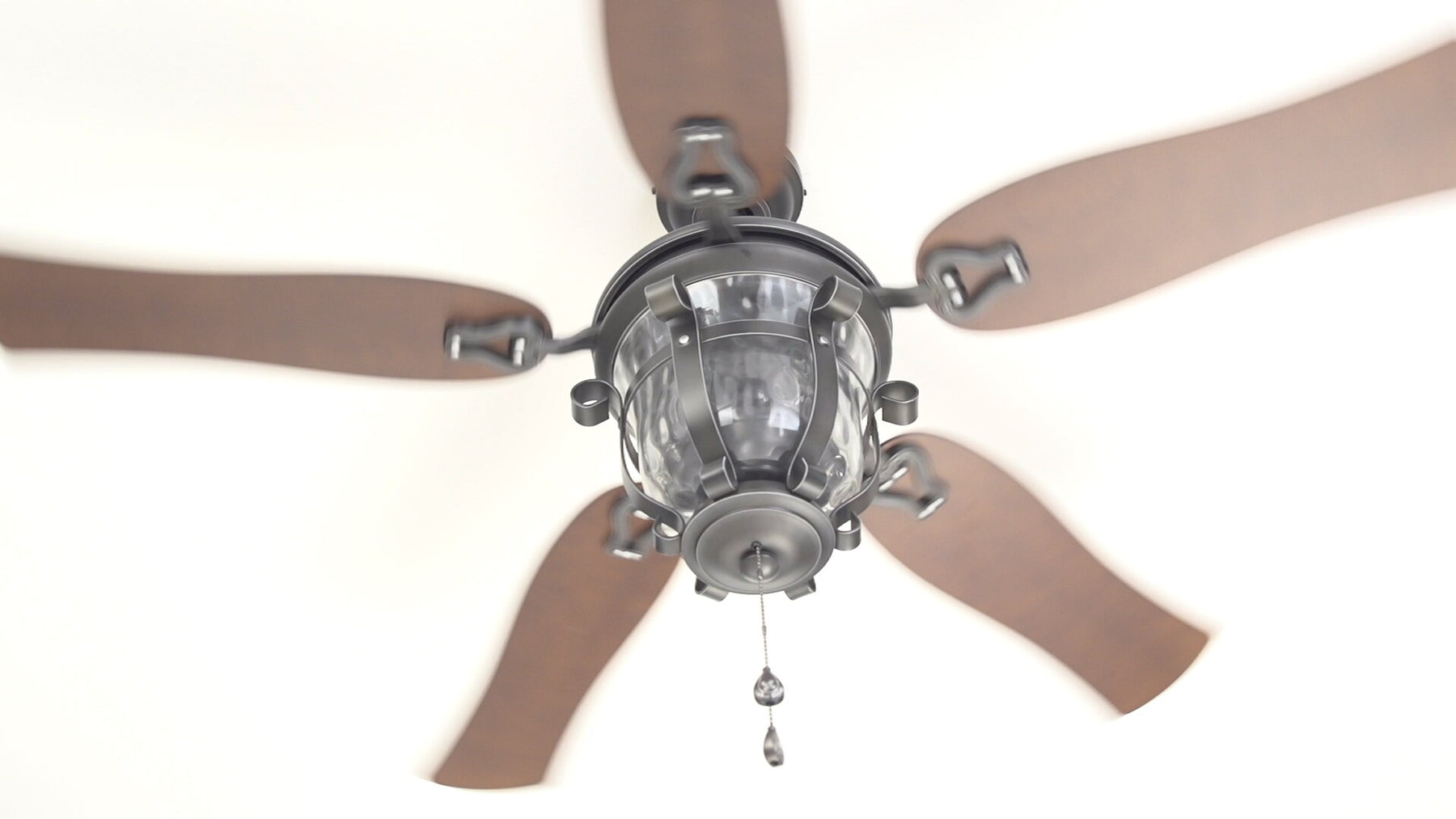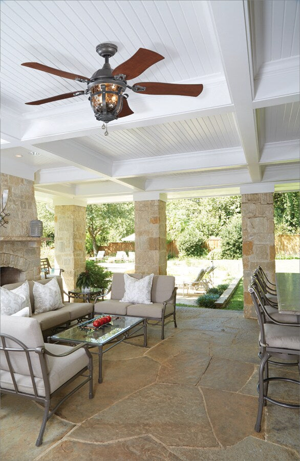 The Lake Placido fan casts a romantic glow with its rippled clear glass lantern, instantly elevating a porch or great room. The sculpted black iron hardware and cinnamon-to-mocha reversible blades bring rich, tactile warmth. Pair it with woven textures and aged brass accents to echo its rustic refinement. It’s an effortless statement of comfort and luxury for indoor and covered outdoor spaces.