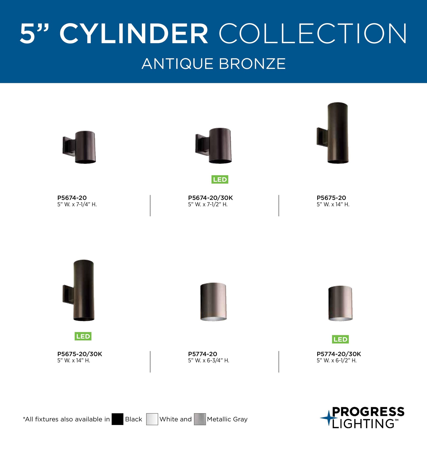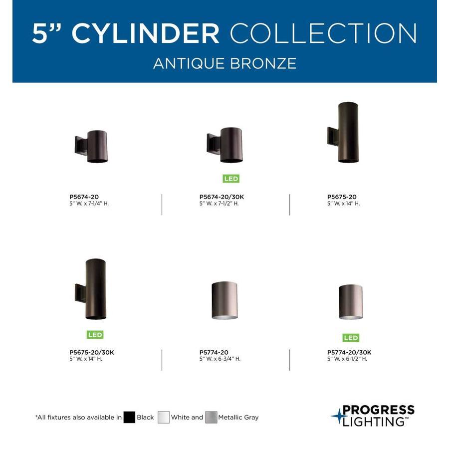 A sleek, 5-inch cylinder flush mount crafted from durable aluminum in an antique bronze finish. Wet-location listed for outdoor use yet refined enough for interiors, it hardwires to ceilings and accepts a single E26 bulb up to 75W for focused, dimmable illumination.