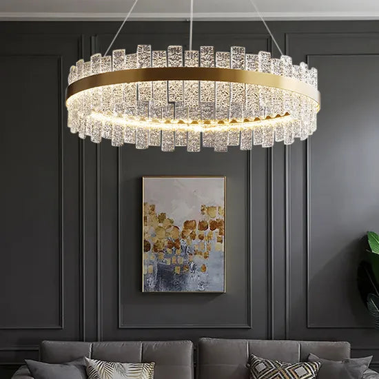 Transform your dining or hotel space with this sublime chandelier, exuding the aura of grand sophistication. Its sumptuous gold finish and intricate glass details command attention, offering a luminous focal point. Consider pairing this piece with richly hued textiles and refined decor to enhance its opulent glow. A quintessential statement piece, this chandelier defines contemporary luxury, making it indispensable for those who cherish exquisite design.