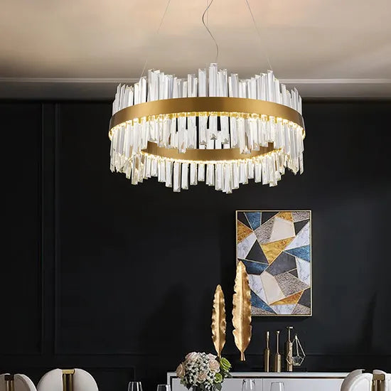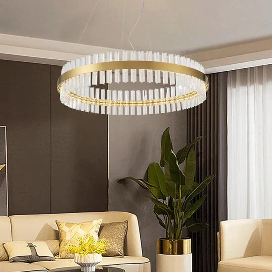 The Hotel Modern LED Chandelier is an enchanting masterpiece that captures the essence of refined elegance and minimalist charm. With its combination of sleek stainless steel and glistening crystal, it casts a radiant glow that transforms any room into a sanctuary of sophisticated light. Whether placed over a dining table or as a grand centerpiece in a foyer, this chandelier is a testament to modern luxury. Its golden finish harmonizes with diverse palettes, making it an indispensable asset to captivating, high-end interiors.