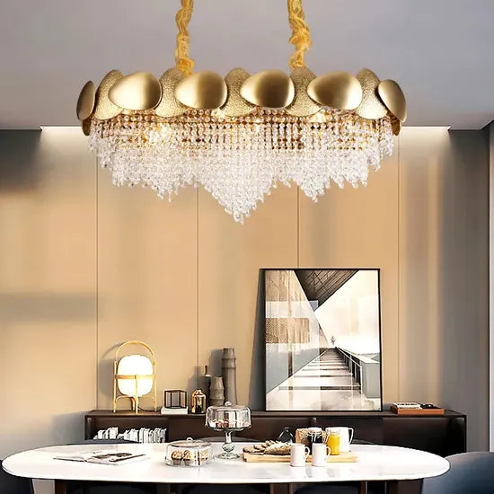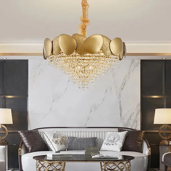 Imagine cascading light that glistens like stars across an evening sky—it illuminates your space with grace and indulgence. The chandelier's most captivating feature is its interplay of opulent gold with striking crystal, which transforms any room into a sanctuary of elegance. Adorned in a living room or dining area, its light weaves a tapestry of warmth and sophistication. This piece is a quintessential element for those who desire unparalleled beauty in their living space.