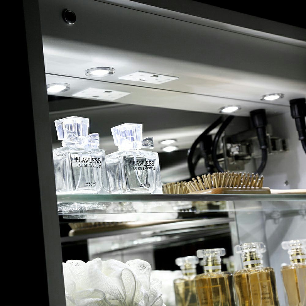 • Shelving: Adjustable glass shelves behind a mirrored right-swing door, providing flexible storage options.