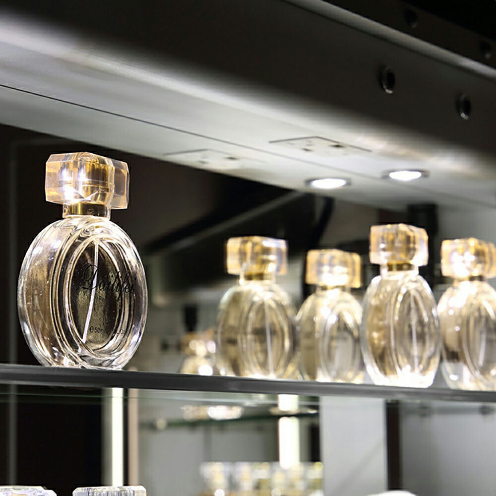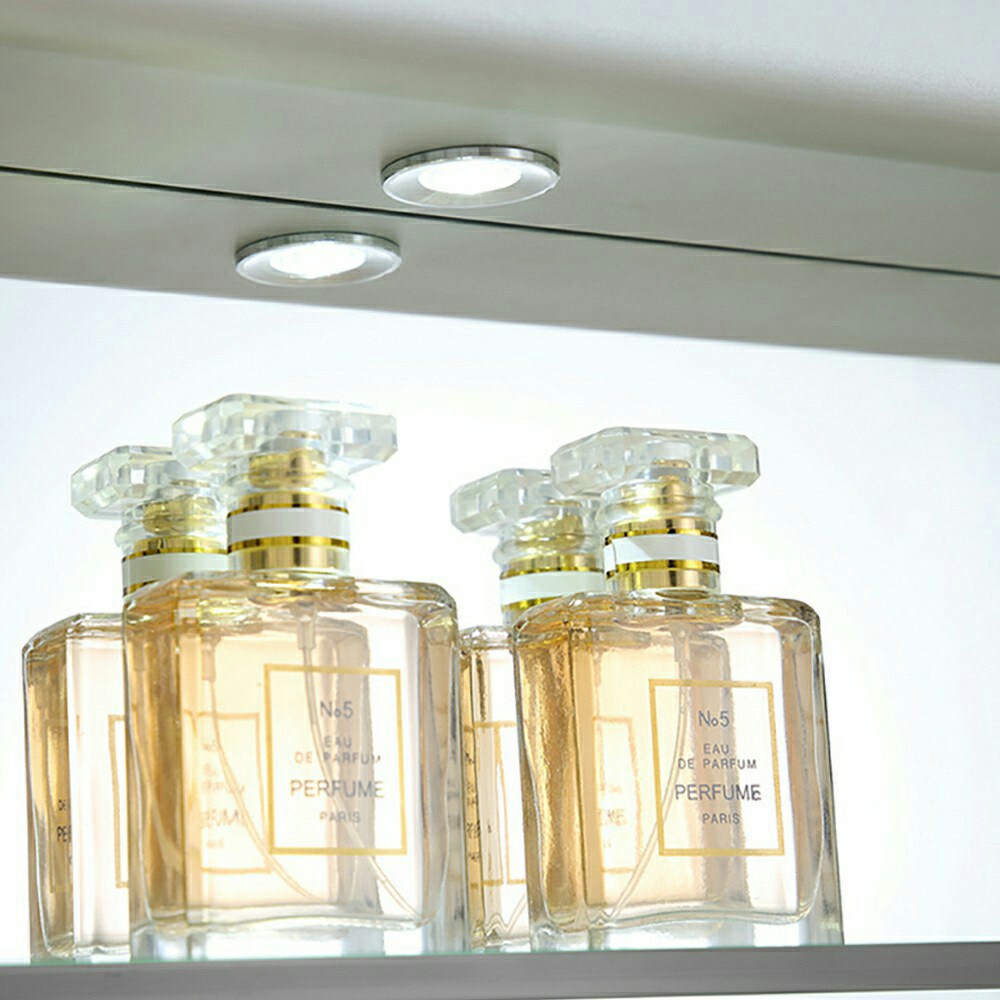 • Shelving: Features 4 adjustable glass shelves and a mirrored back wall.