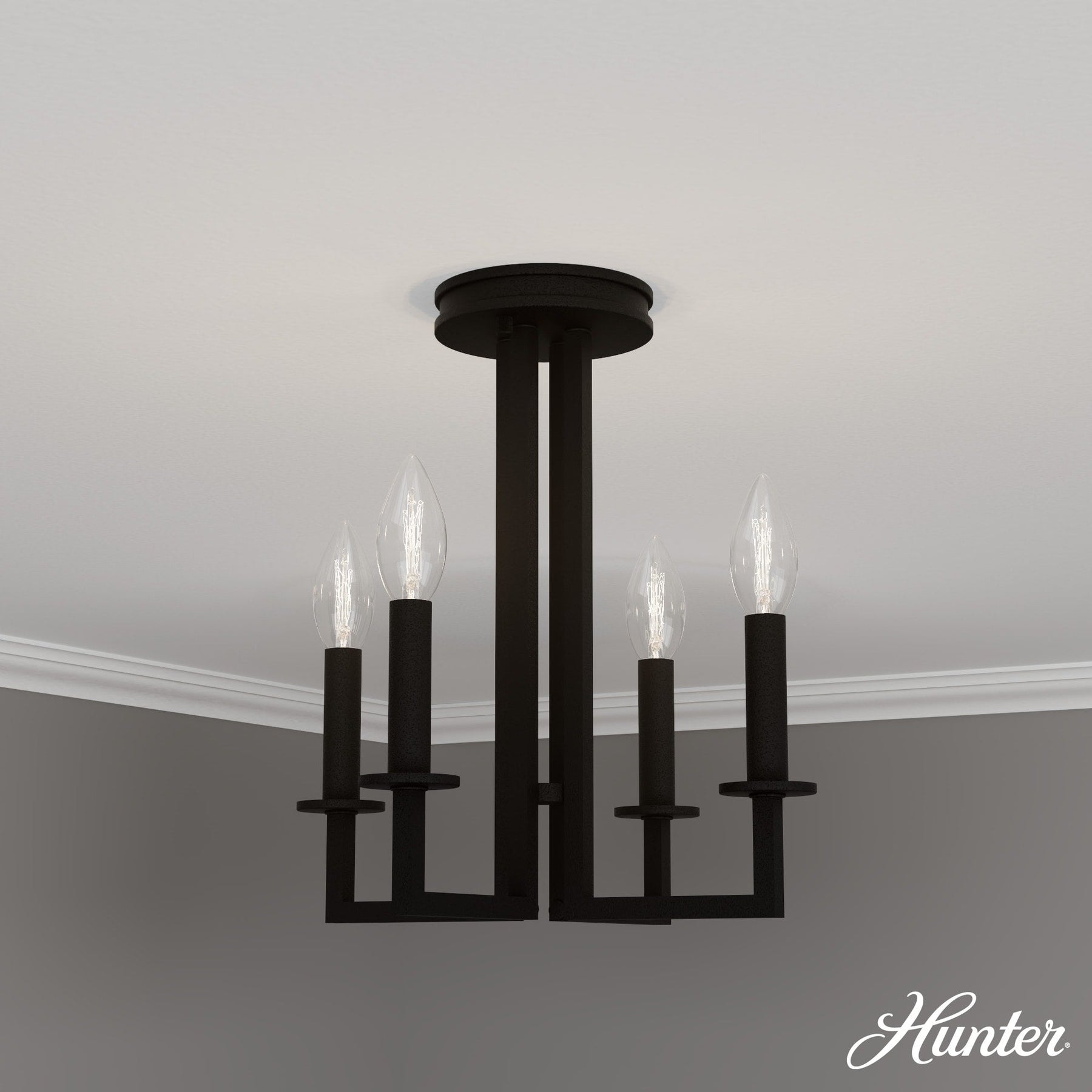 Enhance your living space with the Hunter Bearden 4-Light Satin Black Chandelier, a stunning blend of industrial design and modern elegance. This transitional LED fixture features a bare bulb style, perfect for illuminating a variety of spaces with its geometric aesthetic. Ideal for rooms with lower ceilings, it provides versatile lighting solutions for kitchens, living rooms, and more.