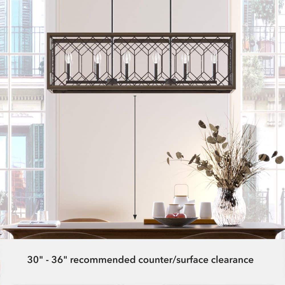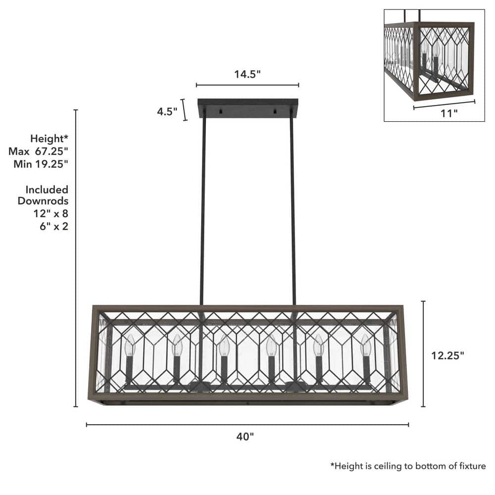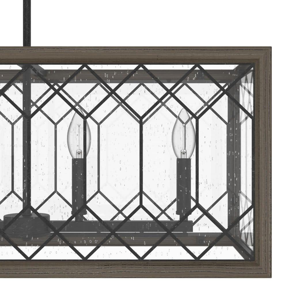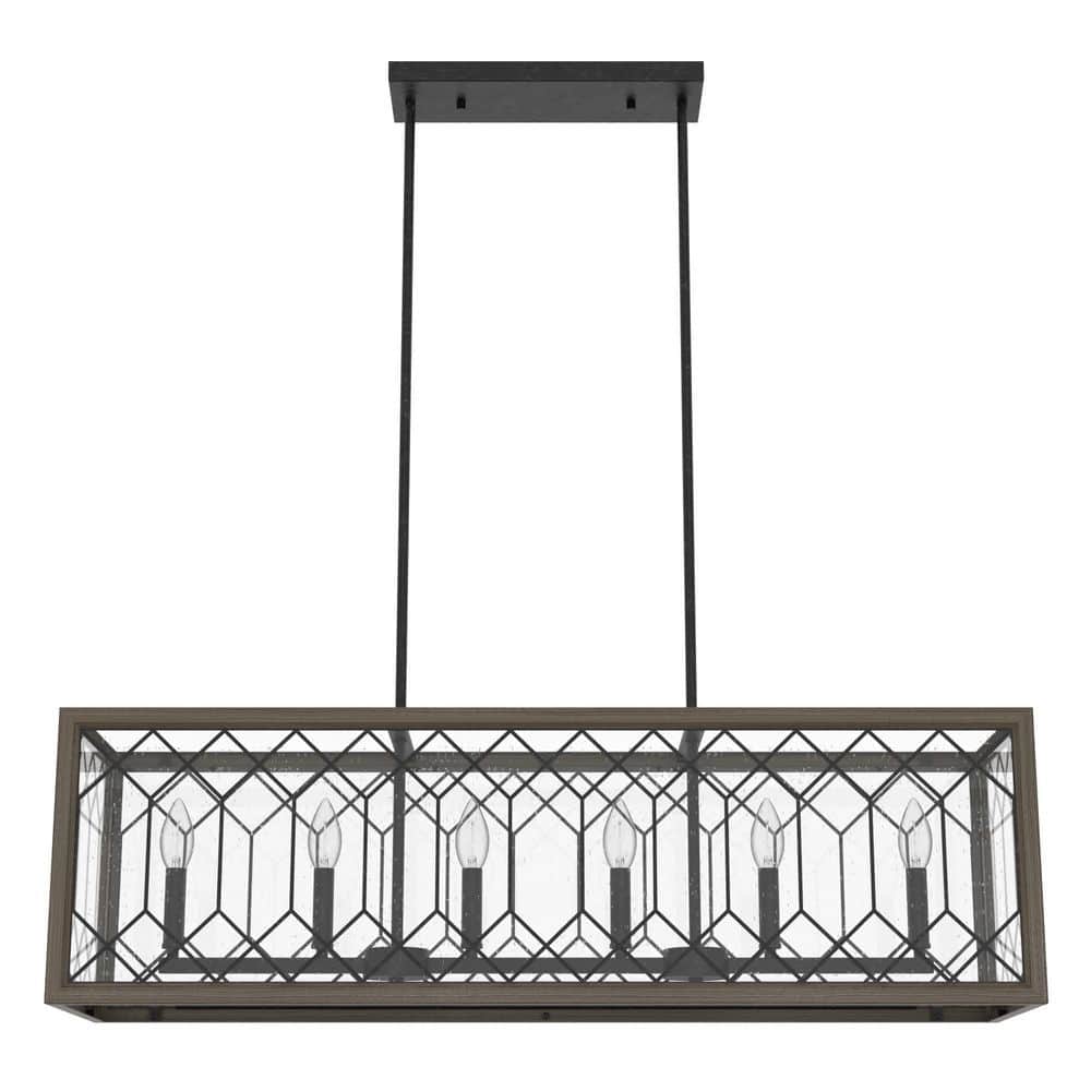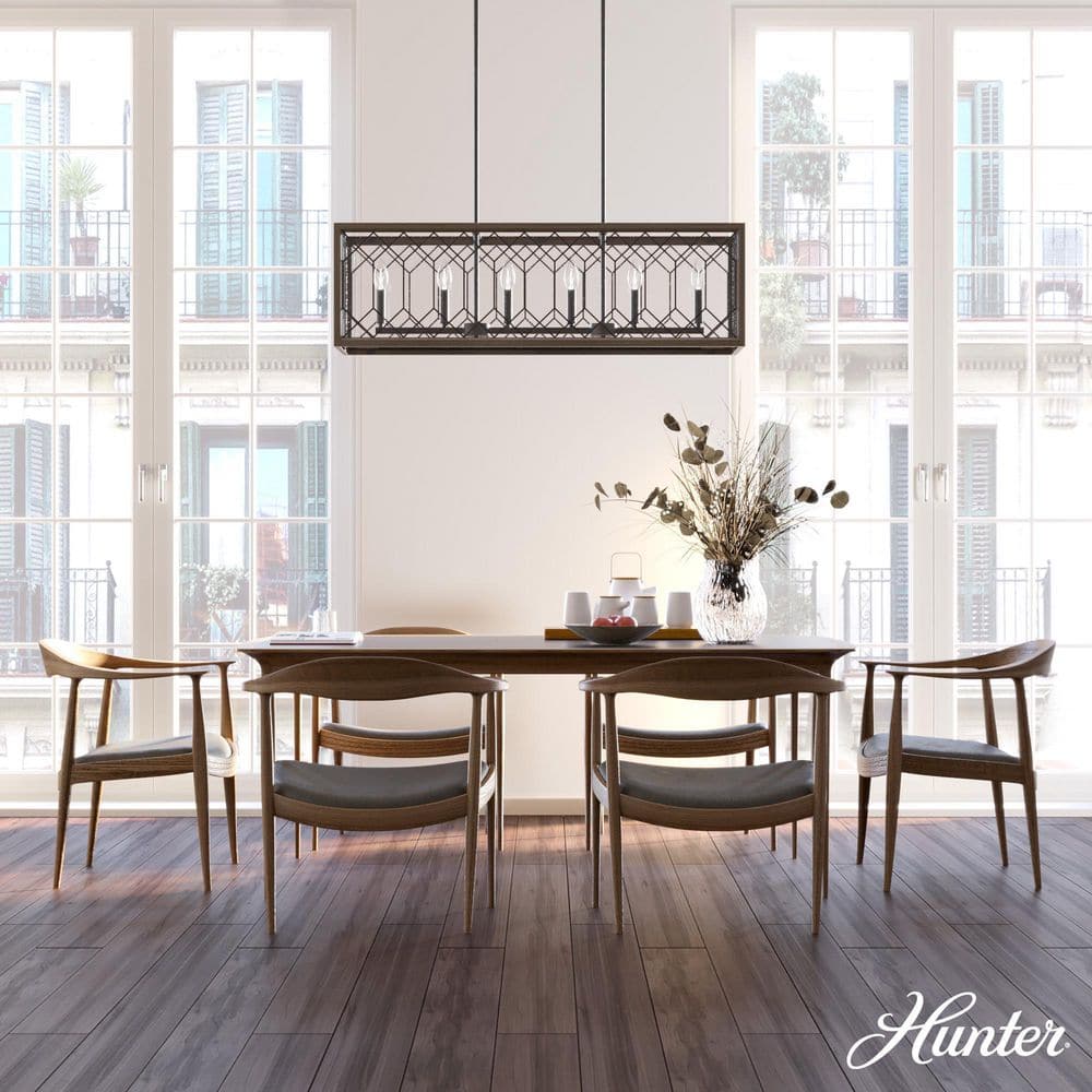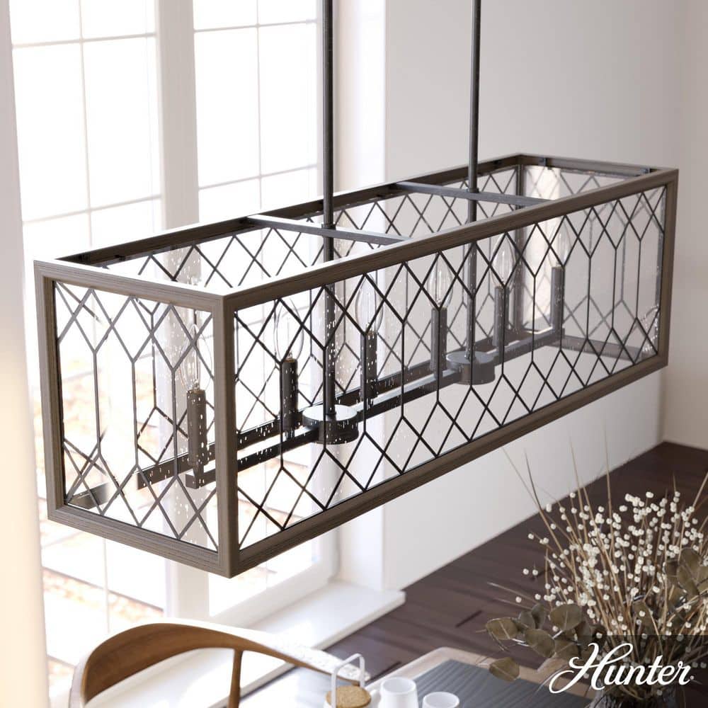 Illuminate your space with the charming Chevron 6-Light Rustic Iron Billiard Chandelier by Hunter. Featuring a captivating lattice design with clear seeded glass shades, this fixture brings a cozy ambiance to any room. Its flexible hanging options and durable construction make it a standout piece for both style and functionality.