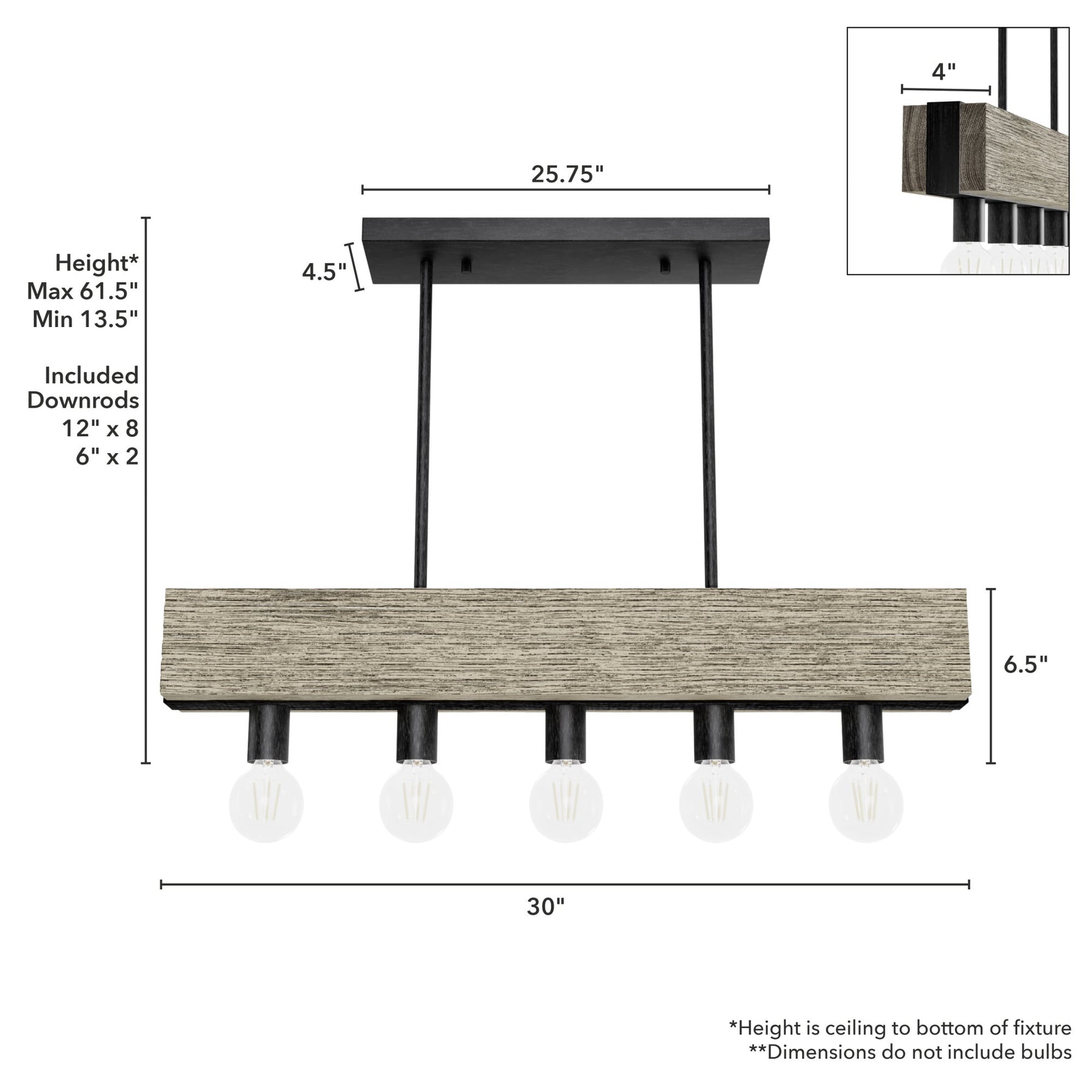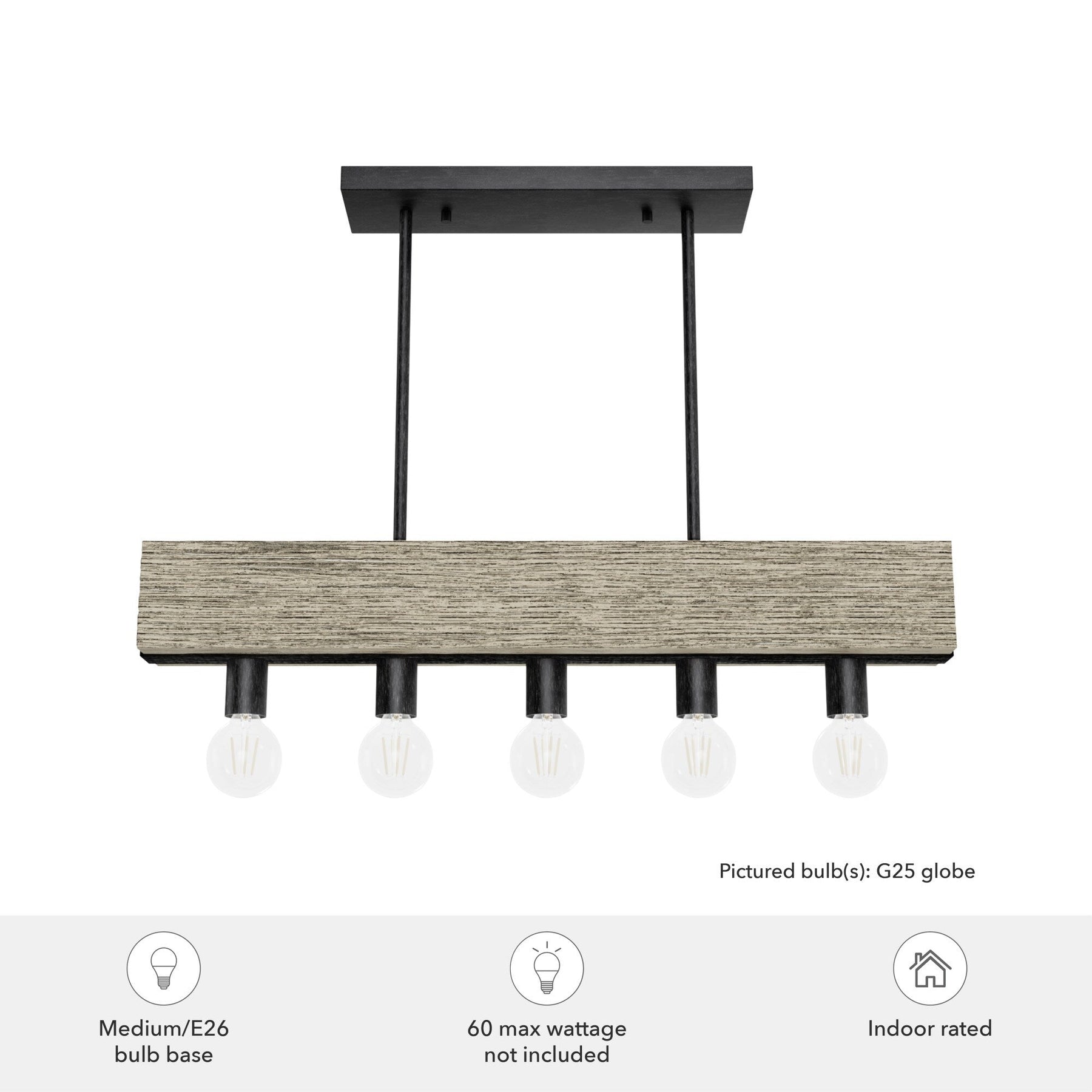 Illuminate your space with the Hunter Donelson 5-Light Chandelier, featuring a sophisticated satin black finish and rustic design. This fixture's bare bulb style and adjustable hanging length offer both flexibility and aesthetic appeal for kitchens, dining rooms, and living areas, merging modern design with vintage charm.