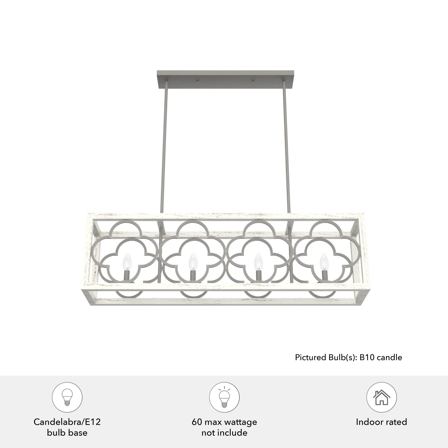 A: This chandelier uses four E12-base light bulbs with a maximum wattage of 60 watts each, or the LED equivalent. Bulbs are not included.