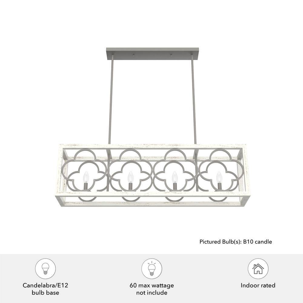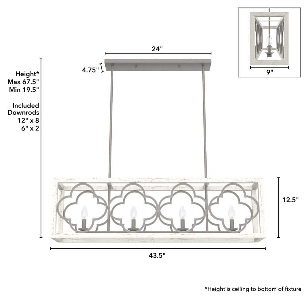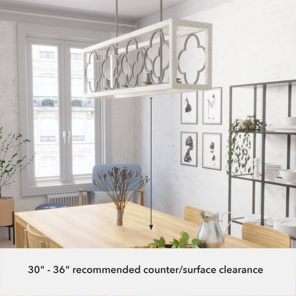 Illuminate your space with the exquisite design of the Hunter Gablecrest 4-Light Linear Chandelier. Its stunning quatrefoil pattern and rustic white finish add a touch of elegance to any kitchen or dining area, while the adjustable downrods provide flexible installation options to suit your decor needs.