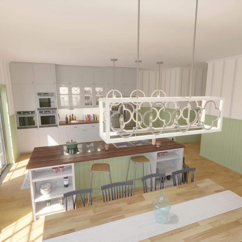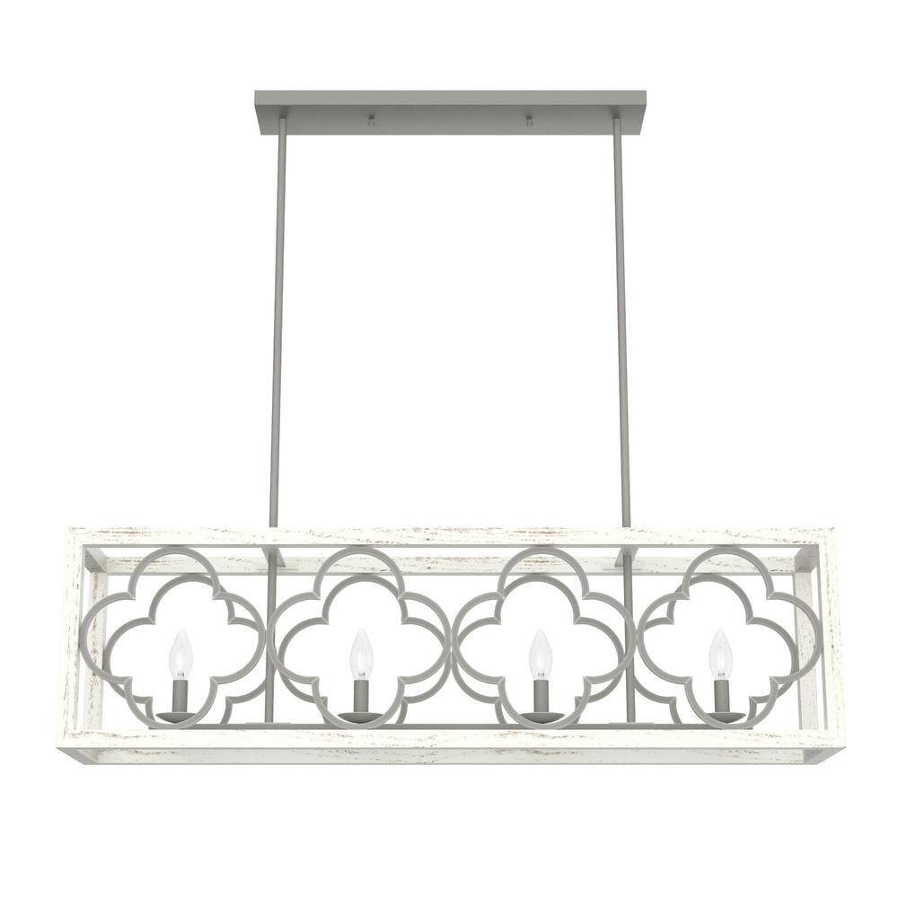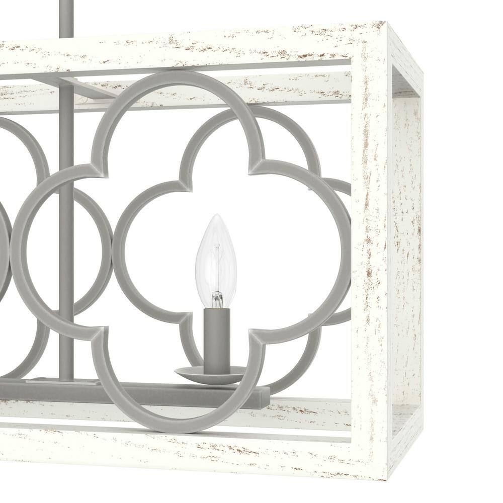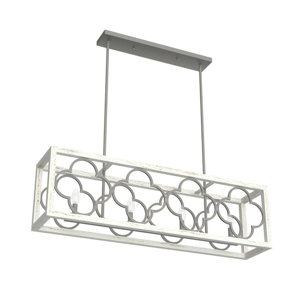 Illuminate your space with the exquisite design of the Hunter Gablecrest 4-Light Linear Chandelier. Its stunning quatrefoil pattern and rustic white finish add a touch of elegance to any kitchen or dining area, while the adjustable downrods provide flexible installation options to suit your decor needs.