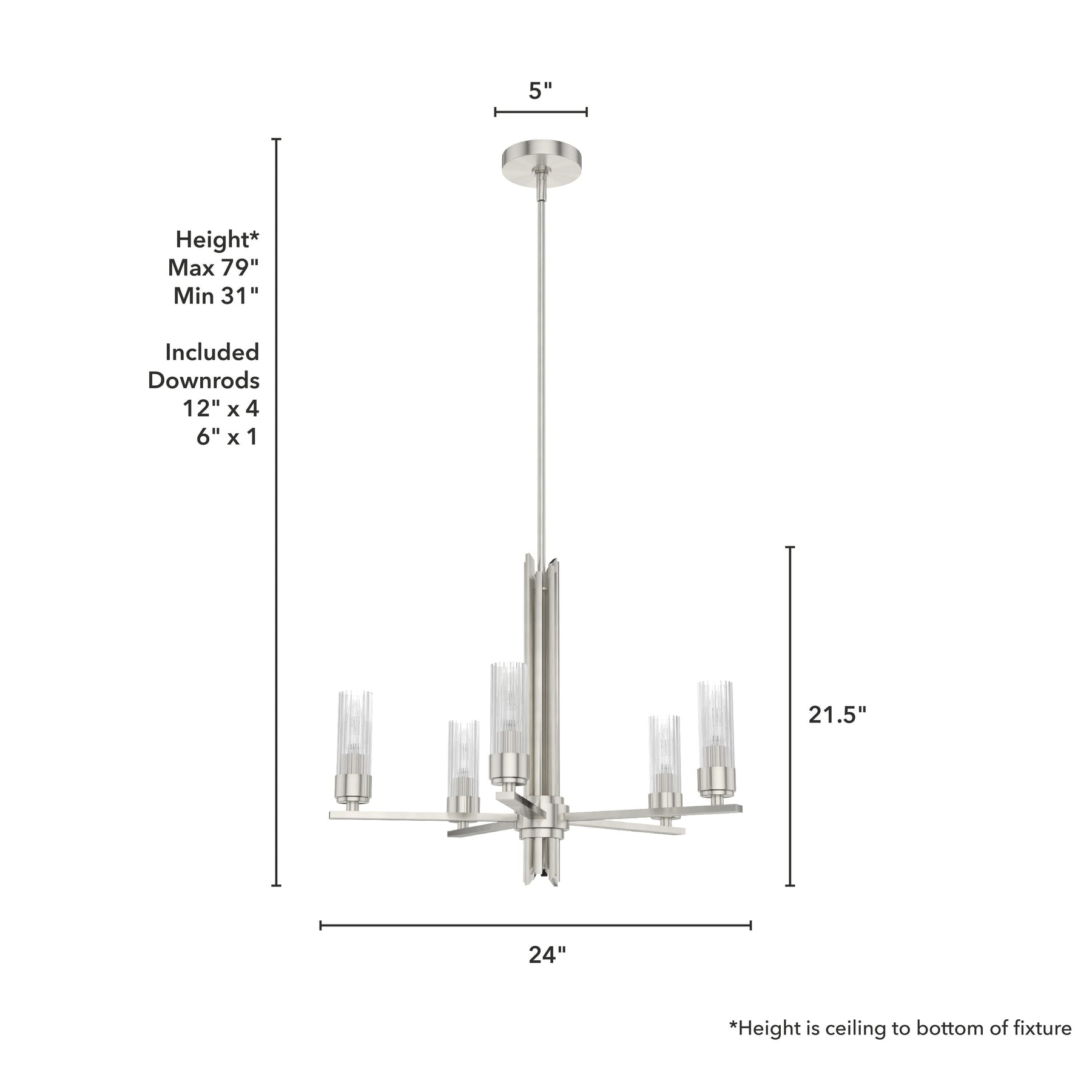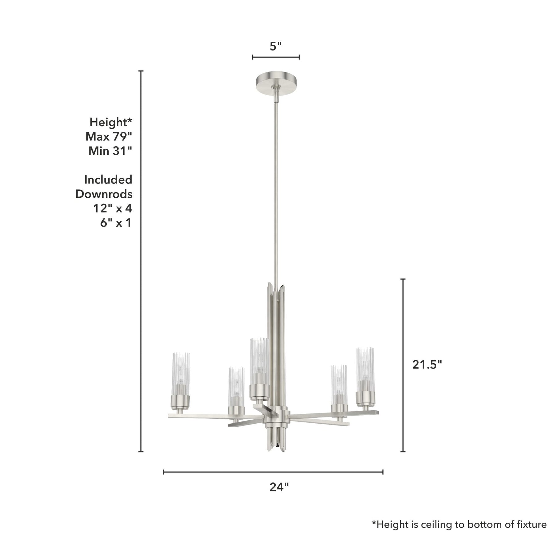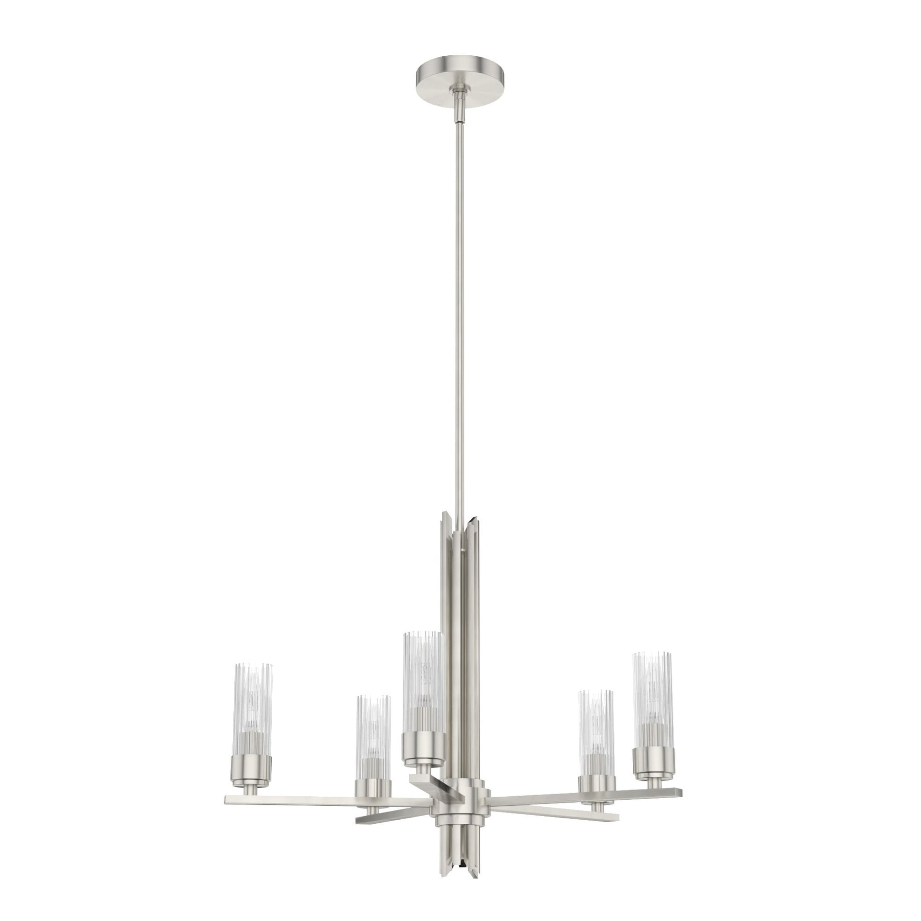Illuminate your space with the sophisticated Gatz 5-Light Chandelier by Hunter. Featuring a modern brushed nickel finish and premium ribbed glass, this fixture is perfect for adding contemporary flair to your kitchen, dining room, or living room. Designed for long-lasting durability and minimal assembly, this chandelier is ideal for both professional contractors and DIY enthusiasts.
