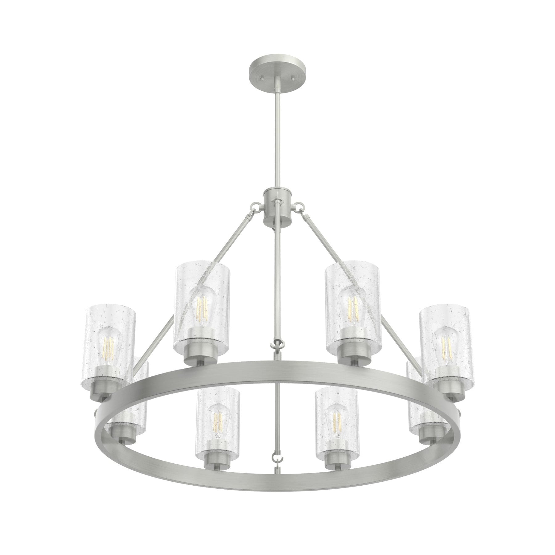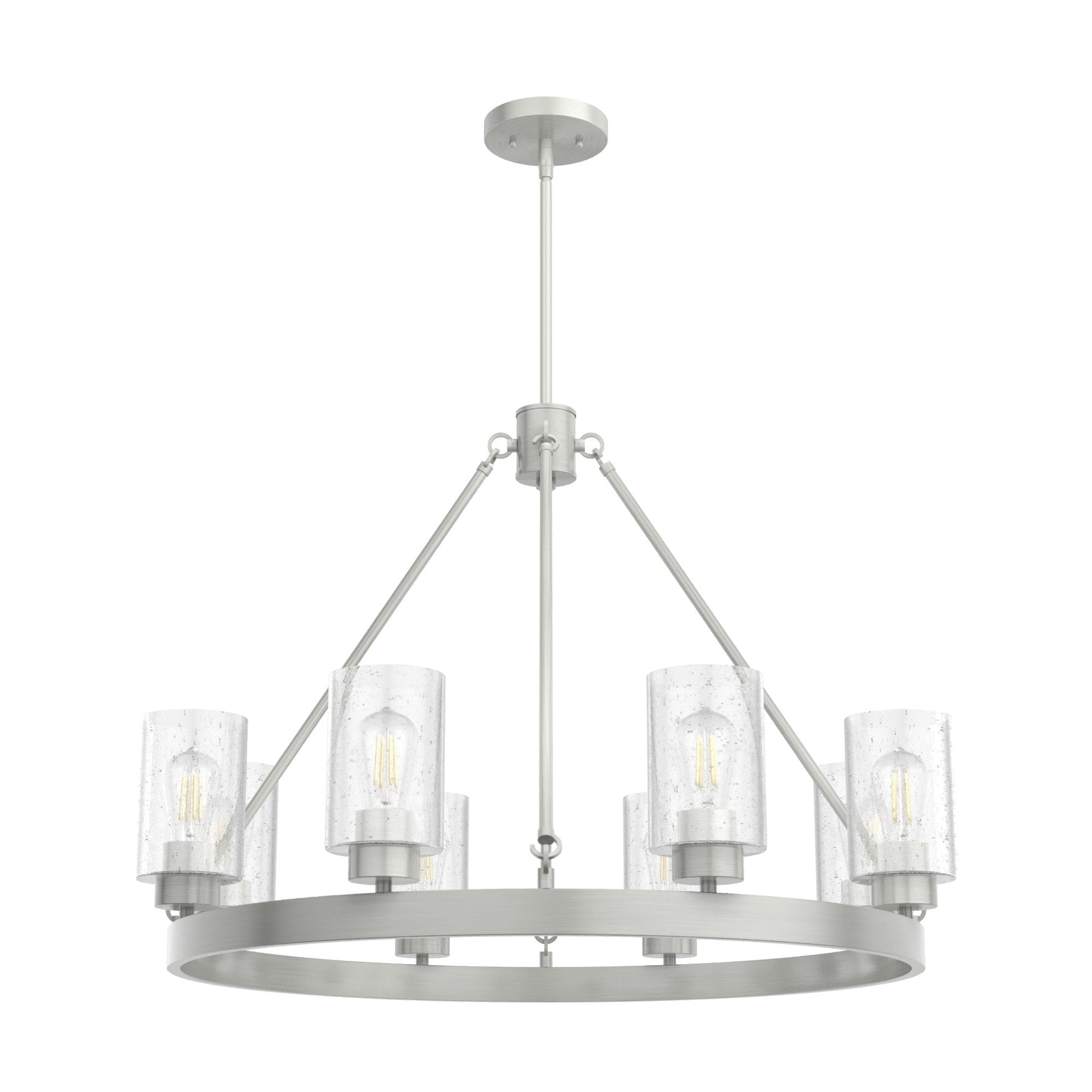 The Hartland 8-Light Chandelier instantly revives any room with its warm, inviting glow and rustic farmhouse appeal. The seeded glass shades delicately diffuse the light, casting sparkling reflections that dance around the space. With its brushed nickel finish and elegant lines, it effortlessly bridges the gap between modern sophistication and timeless charm. Imagine it gracing your dining room or foyer, making every moment feel like a luxurious yet cozy embrace.