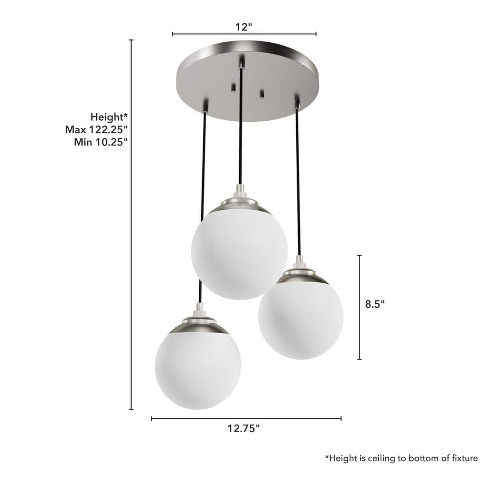 The Hunter Hepburn 3-Light Chandelier showcases a mid-century modern style with a brushed nickel finish and cased white glass shades. It's perfect for illuminating spaces with elegance and adaptability, featuring adjustable hanging lengths and dimmable capabilities to fit various settings.