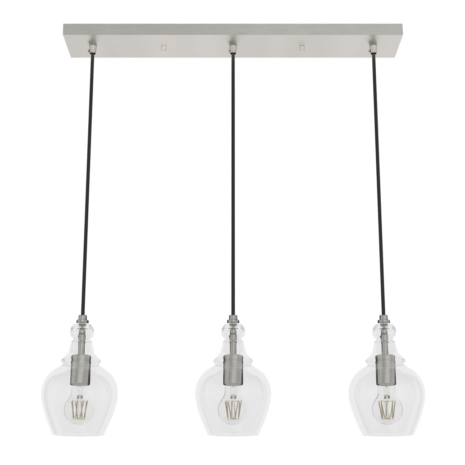 Brighten kitchens and dining spaces with Hunter’s Maple Park 3-light linear cluster. Clear glass shades and a brushed nickel finish deliver a clean, casual look, while the adjustable cord makes installation simple for a perfect hang.