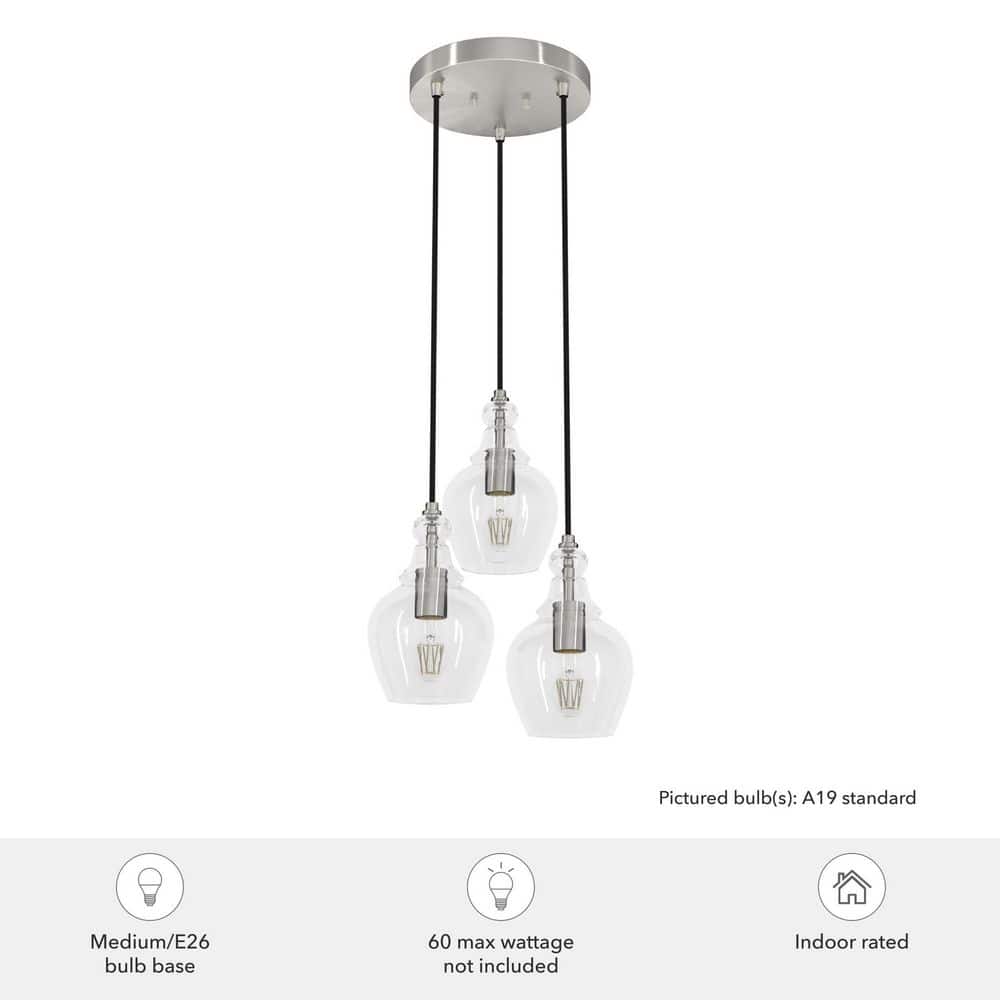 Elevate your space with the Hunter Maple Park 3-Light Chandelier, featuring a sleek brushed nickel finish and clear glass shades. This contemporary fixture is ideal for kitchens, dining rooms, and entryways, offering a warm, inviting glow with its trio of elegantly suspended lights.