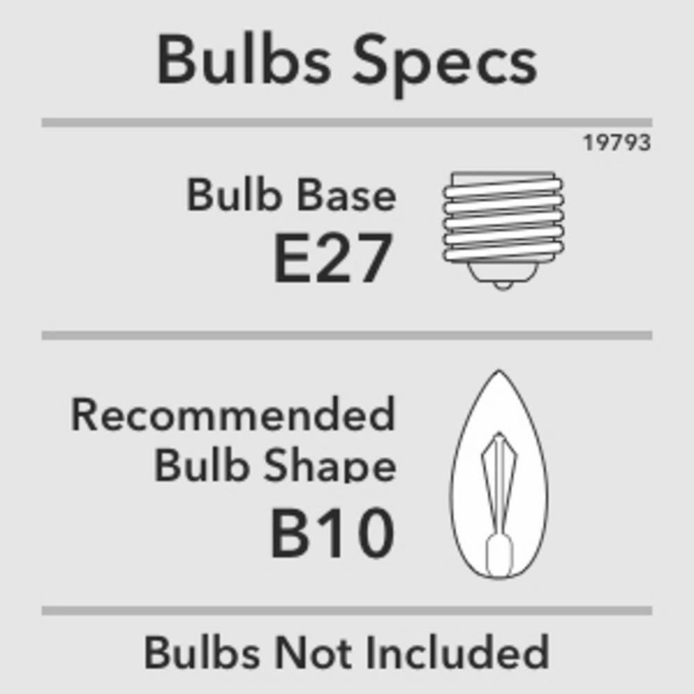 A: The chandelier requires five E26-base B10 candle bulbs, with a maximum of 60 watts each. LED equivalents are also suitable.