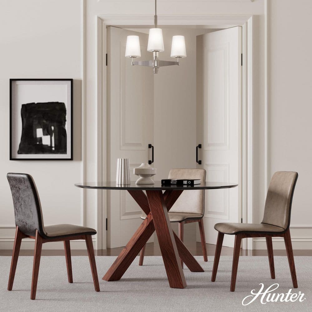 Transform your space into a sanctuary of style with the Hunter Nolita Chandelier. Its brushed nickel finish reflects modern sophistication while exuding warmth through its cased white glass shades. Imagine it delicately draped above a chic dining table or illuminating a cozy living room corner—each glow a whisper of elegance. This chandelier isn't merely a fixture; it's an essential statement piece for a life enriched by luxurious design.