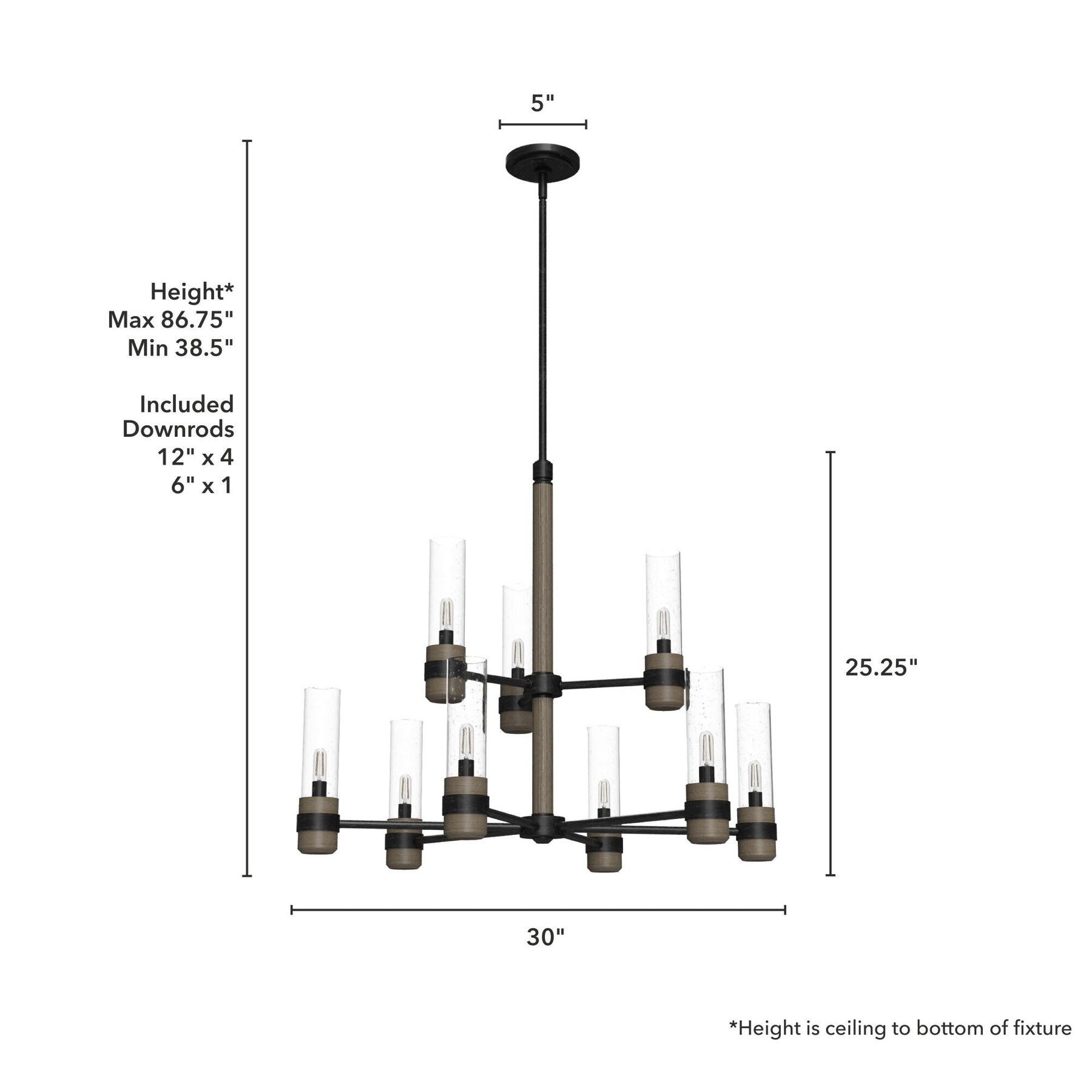 A: The chandelier comes with a 6-inch downrod and four 12-inch downrods, allowing for hanging adjustments from 37.5 inches to 86.75 inches.