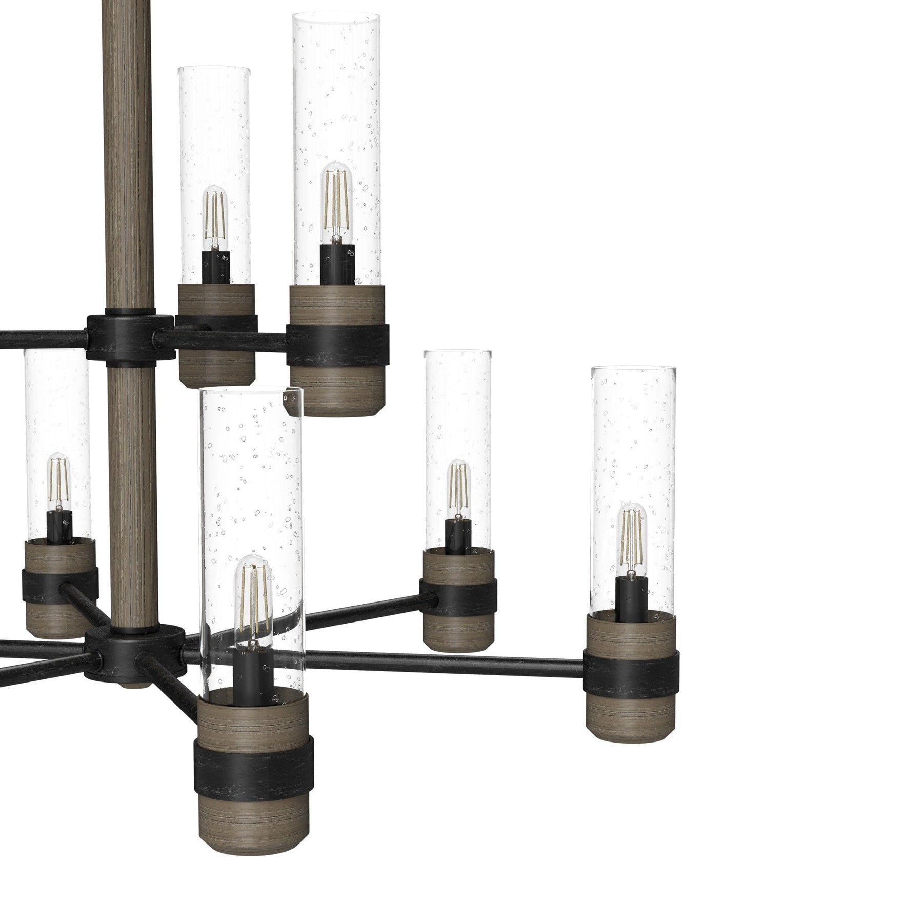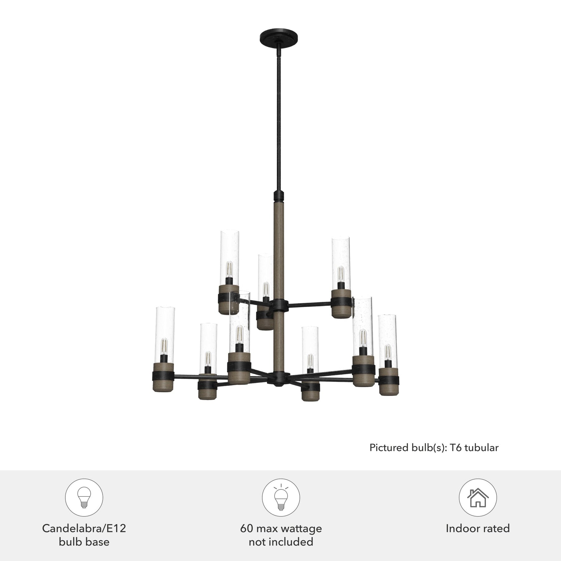 Illuminate your living spaces with the rustic charm and modern flair of the River Mill 9-Light Matte Black Chandelier from Hunter. Combining wood-inspired metal with clear seeded glass, this fixture balances rustic elegance with contemporary aesthetics, making it perfect for kitchens, living rooms, or dining areas. With adjustable hanging options and easy DIY installation, this chandelier offers both beauty and convenience.