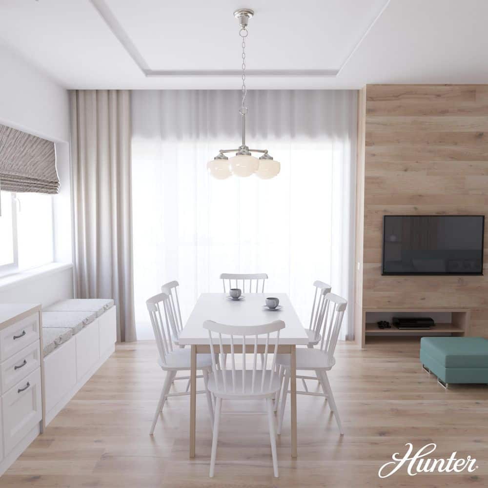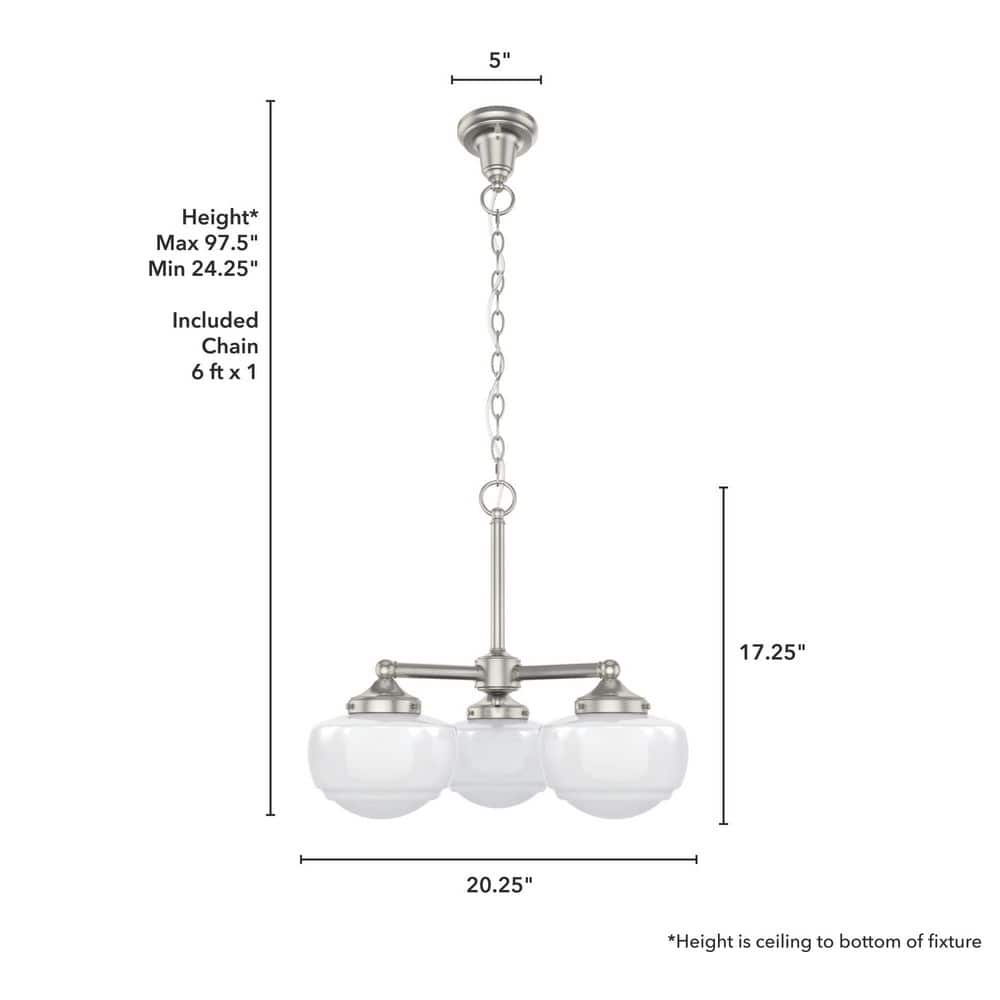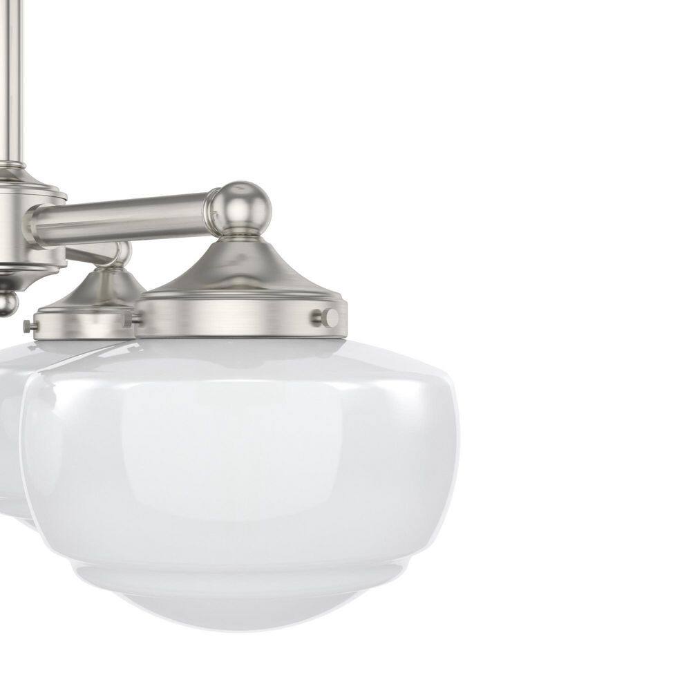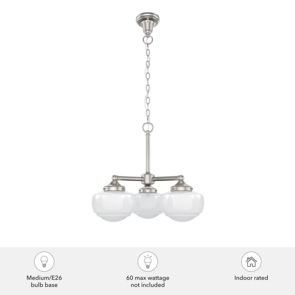 Illuminate and elevate your home with the Saddle Creek 3-Light Brushed Nickel Chandelier from Hunter. Featuring timeless schoolhouse design with cased white glass shades, this fixture seamlessly blends traditional appeal with modern elegance. Perfect for dining areas, foyers, and kitchens, it's an ideal choice for both pros seeking professional installations and DIY consumers looking for an easy upgrade.