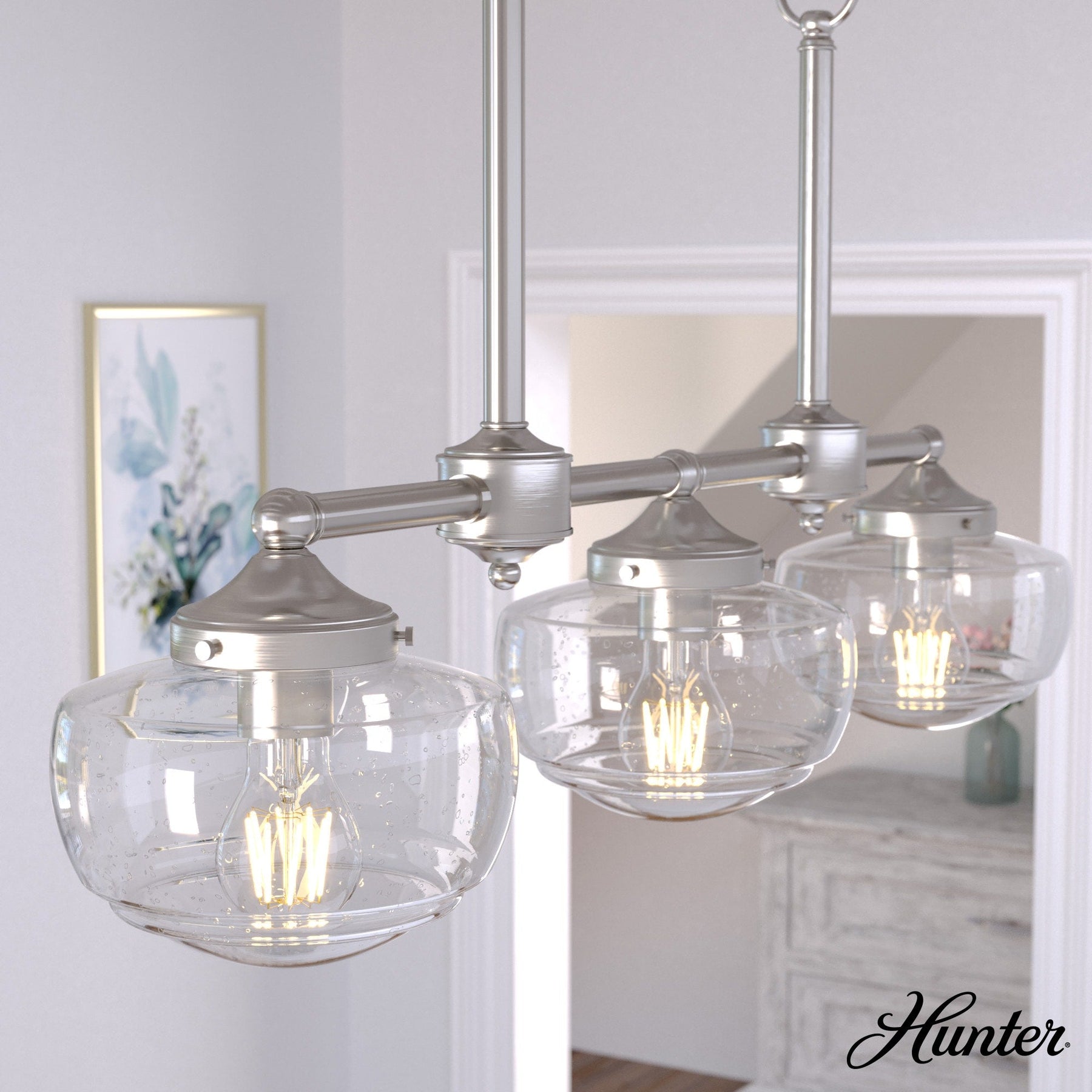 Illuminate your space with the Hunter Saddle Creek 3-Light Chandelier, featuring a sleek brushed nickel finish and distinctive seeded glass shades. This transitional LED fixture delivers a refined blend of modern appeal and classic elegance, making it ideal for kitchens, dining areas, and living rooms.