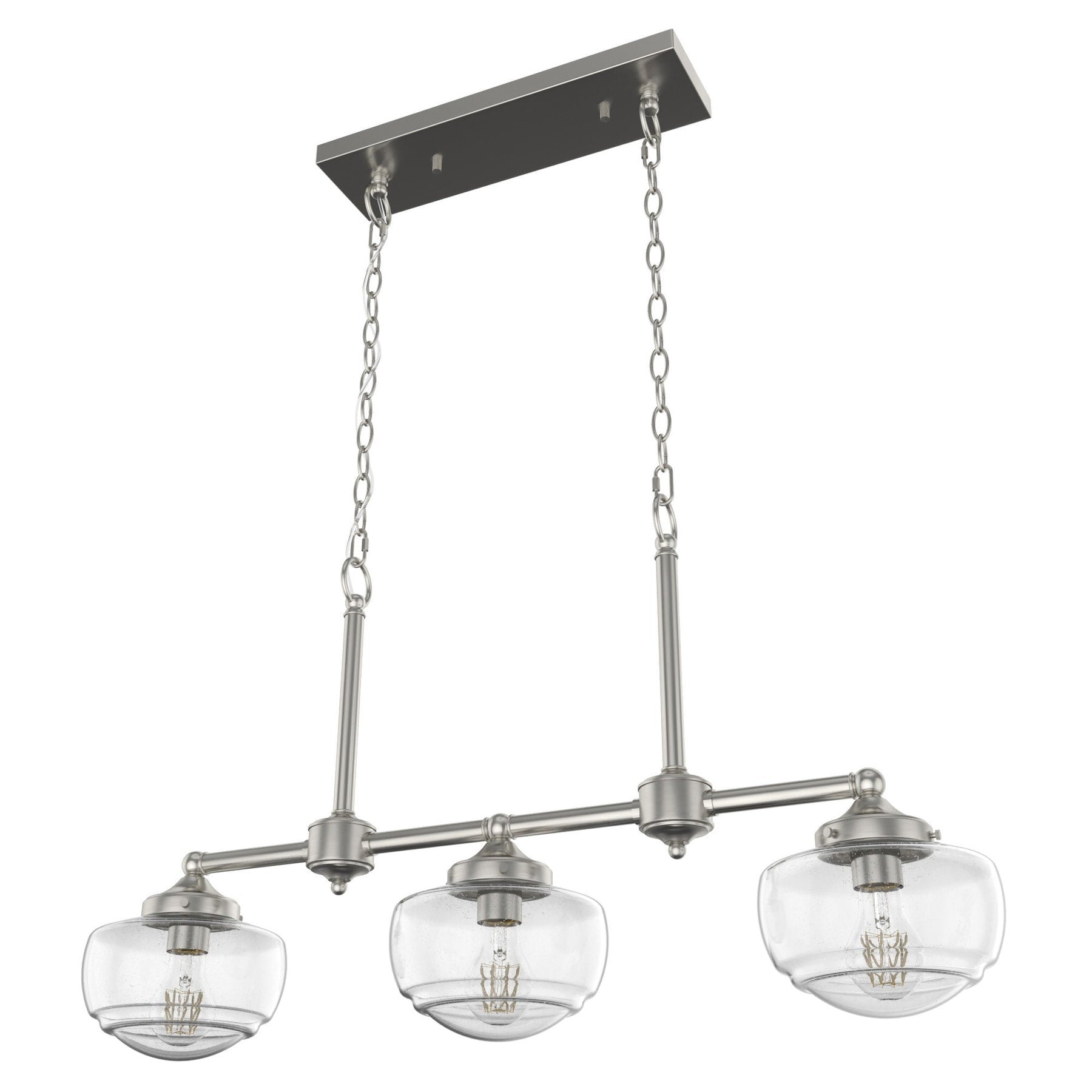 Imagine this chandelier becoming the centerpiece of your dining area, its brushed nickel finish exuding a refined taste that transcends trends. The seeded glass globes offer a textured allure, casting a warm, inviting glow that's both modern and classically cozy. Picture the fixture draped elegantly over a rustic wooden table or gliding gracefully above a marble island. The Saddle Creek chandelier is more than just illumination—it's an artful statement that seamlessly blends sophistication with a touch of schoolhouse nostalgia, inviting luxury into everyday living.